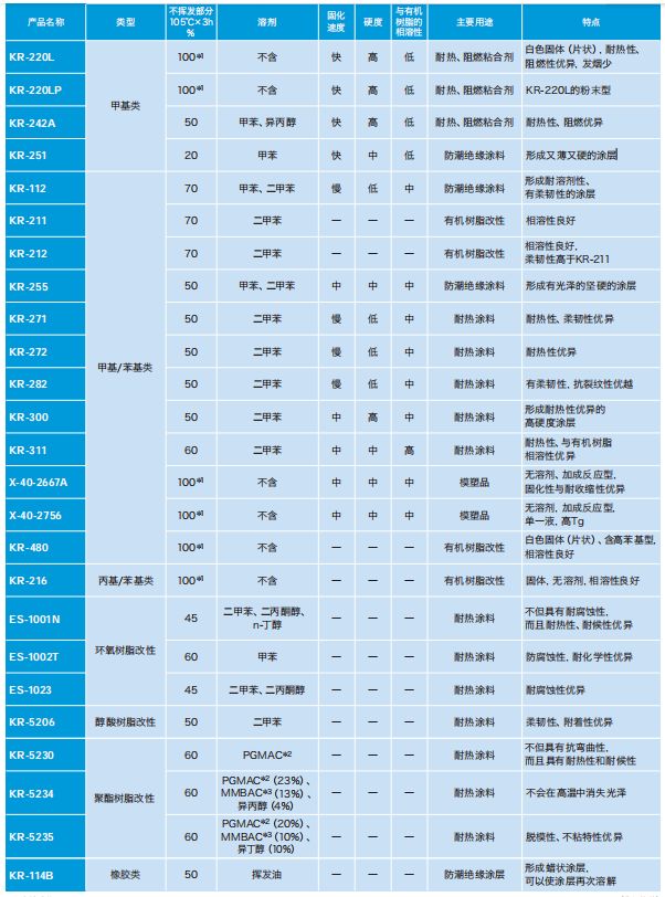 甲基/苯基有机硅树脂:是有机取代基由甲基和苯基构成的有机硅树脂。可形成耐热性优异,具有机械性强度和光泽的涂层。
