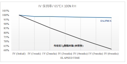 ES-370US 具有超强的抗水性能。在恒温恒湿箱中保持 1mm 厚度的薄膜,并通过测定特性粘度(分子量)降低的数值来衡量耐水性。ES370US 的 IV 值仅下降 2-3%,而目前应用于各种粘合剂的传统低 Tg 产品其初始分子量下降至 60%以下。