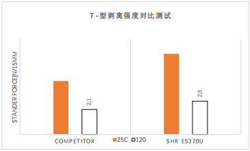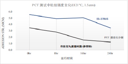 将 PET/PET 层压膜保存在杀菌压力容器中,通过测试粘附强度的降低来评估其耐水性。ES-370US 的强度保持率超过初始强度的 60-70%。24 小时后,强度下降主要是由于 PET 膜本身的老化(在 T 剥离试验期间,PET 膜断裂,而粘合剂仍表现出较高的粘合强度)。