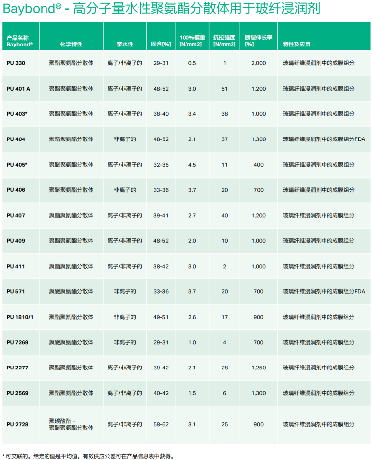 科思创 Baybond 高分子量水性热活化型聚氨酯分散体用于玻纤浸润剂 PU330 PU401A PU403 PU404 PU405 PU406 PU407 PU409 PU411 PU571 PU1810/1 PU7269 PU2277 PU2569 PU2728
