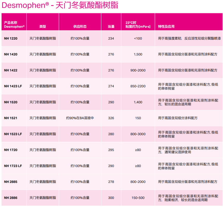 科思创 Desmophen 天门冬氨酸酯树脂 NH1220、NH1420、NH1422、NH1423 LF、NH1520、NH1521、NH1523 LF、NH1720、 NH1723 LF、NH2885、NH2886
