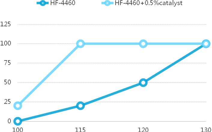 建议添加0.5%的催化剂,能在115-120度30分钟干燥完全,但是添加0.5%的催化剂会降低成品的储存稳定性,通过实验数据表明,在添加了0.5%的锡催化剂后,在40度温度下连续放置5天粘度变化很大(40度一天约为25度3天),在不加催化剂的情况下在40度放置60天粘度轻微变化,所以推荐如果货物需要放置时间长的情况下,使用前再添加催化剂更能保证产品的储存稳定性。