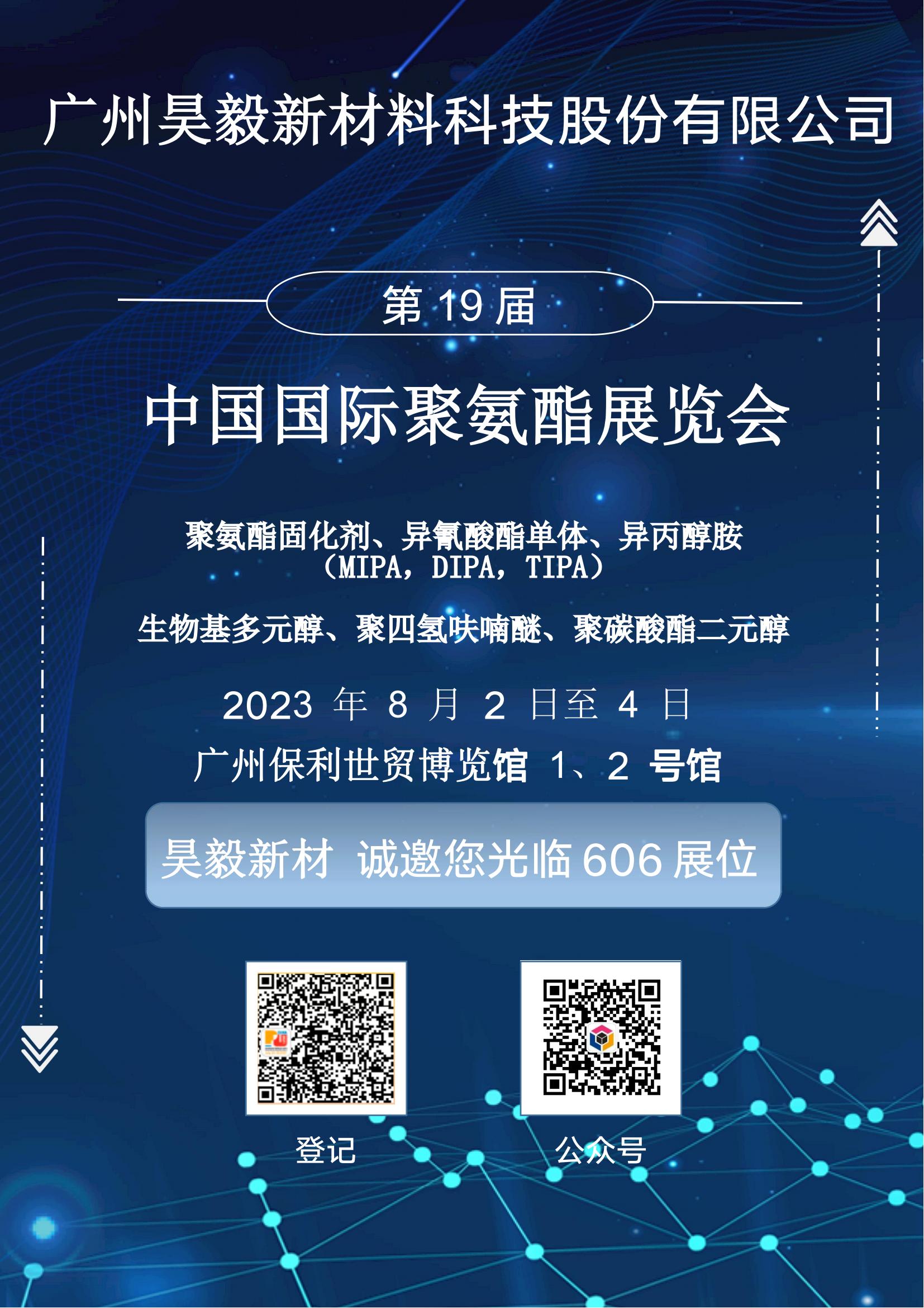 2023年8月2日-8月4日,第十九届中国国际聚氨酯展览会(PU China 2023)将在广州保利世贸博览馆举行,bepaly tw 在本次展览会将展出聚氨酯固化剂、异氰酸酯单体、异丙醇胺(MIPA,DIPA,TIPA)、生物基多元醇、聚四氢呋喃醚、聚碳酸酯二元醇。