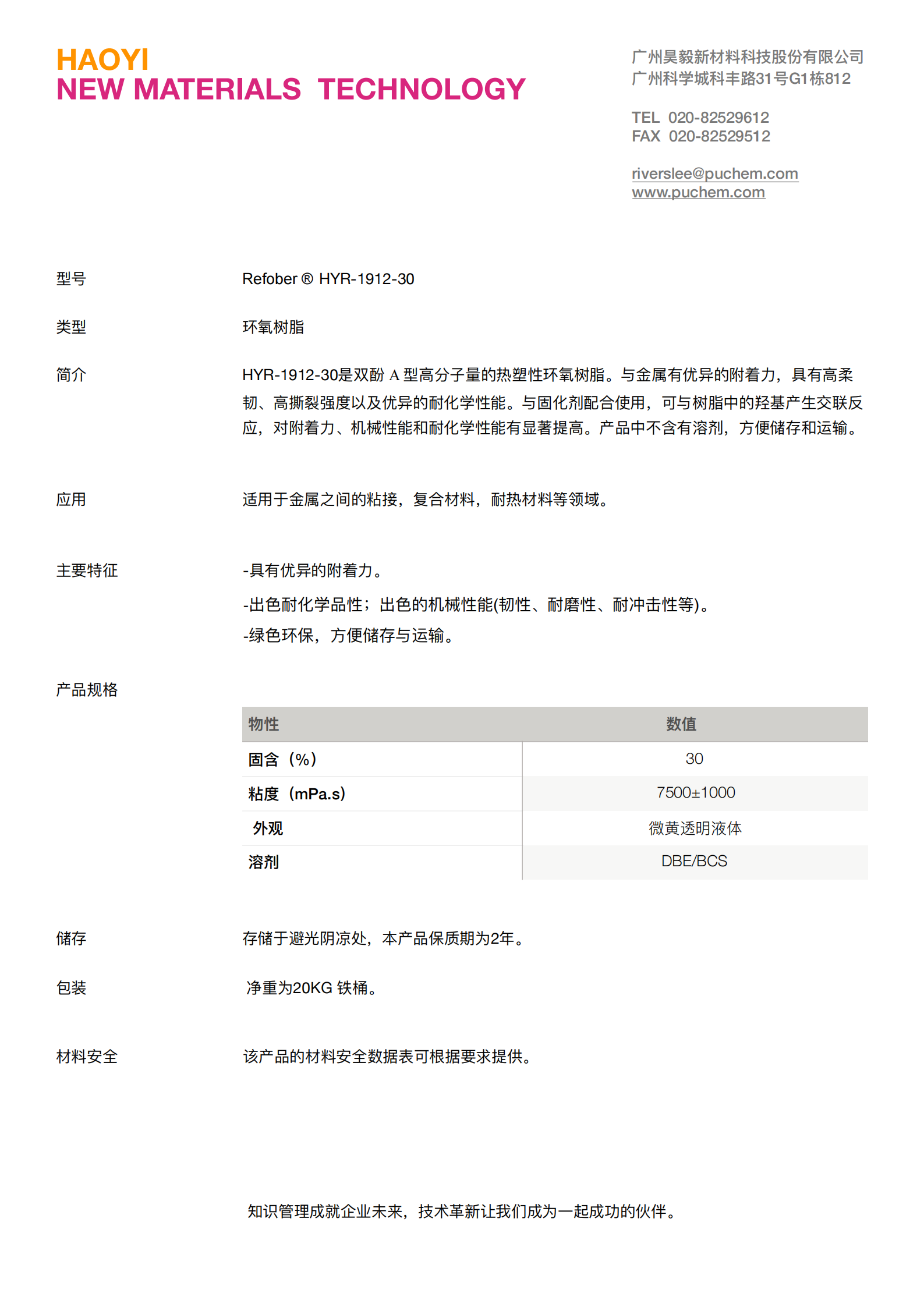 HYR-1912-30 双酚 A 型高分子量的热塑性环氧树脂,出色耐化学品性;出色的机械性能