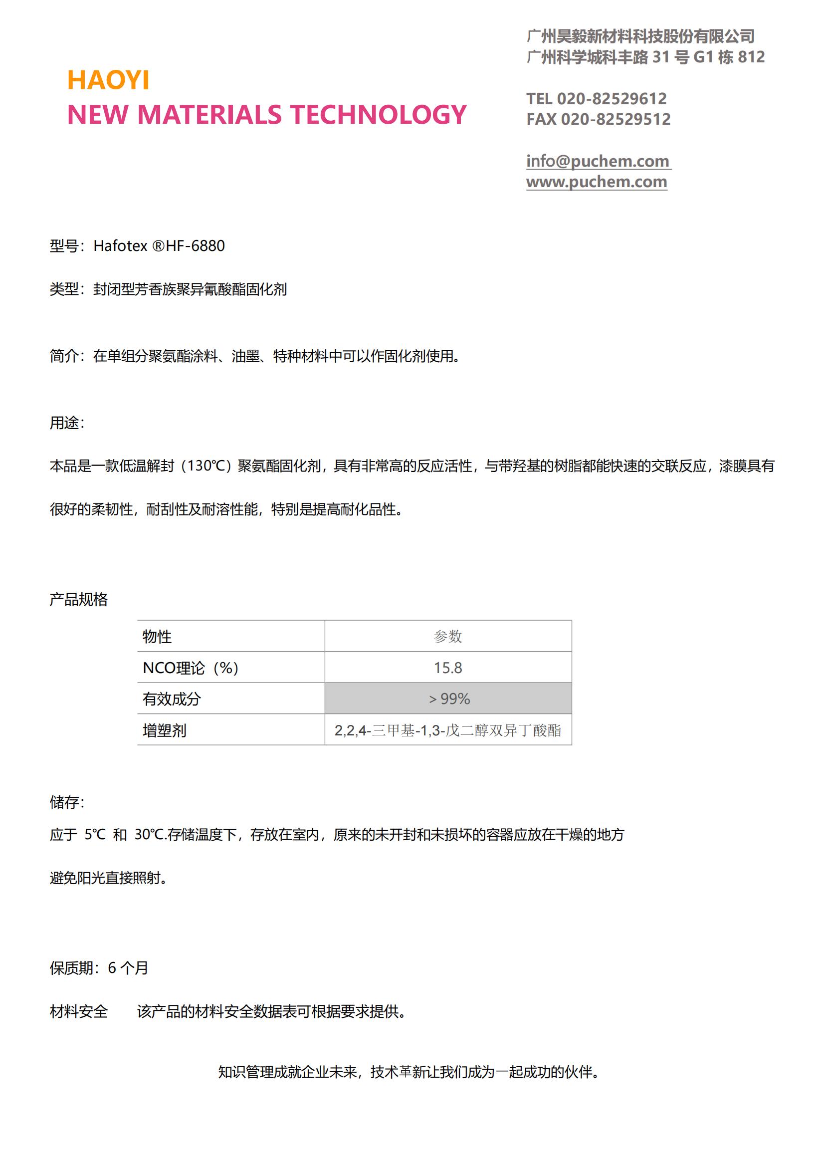 Hafotex ® HF-6880 封闭型130度解封固化剂 具有非常高的反应活性,与带羟基的树脂都能快速的交联反应