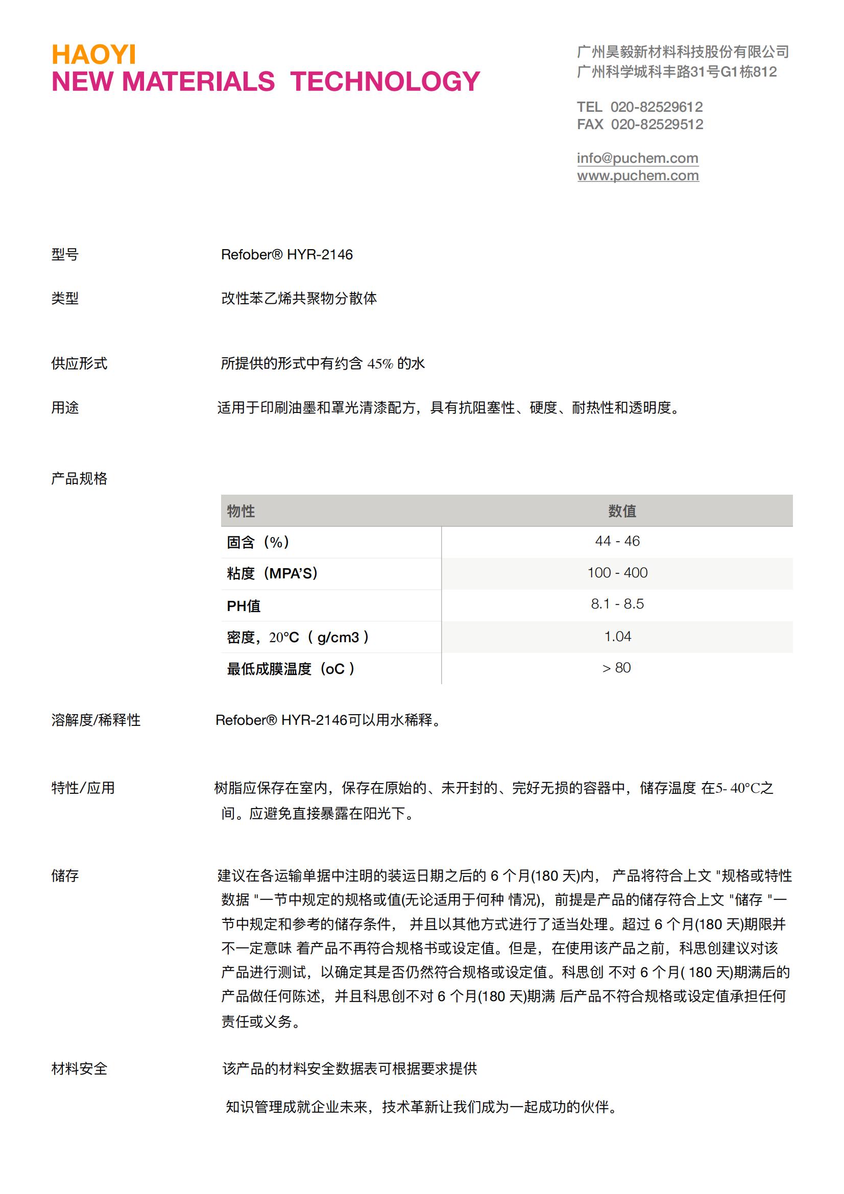 Refober® HYR-2146 改性苯乙烯共聚物分散体 适用于印刷油墨和罩光清漆配方