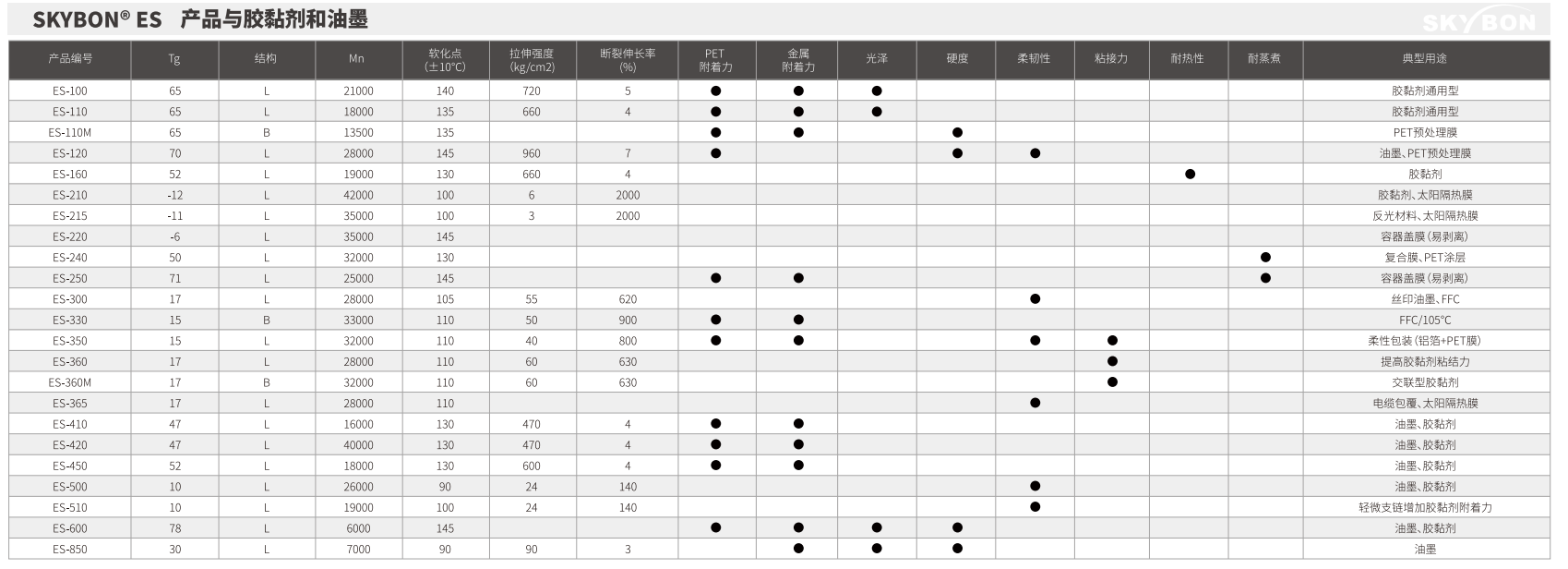 SKYBON®ES 产品与胶黏剂和油墨 ES-100 ES-300 ES-330 ES-360M ES-410 ES-420 ES-850