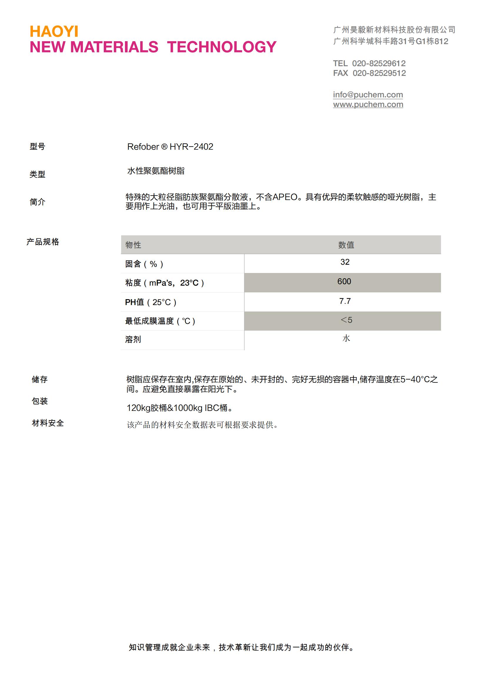Refober ® HYR-2402 水性聚氨酯树脂 具有优异的柔软触感的哑光树脂,主要用作上光油,也可用于平版油墨上