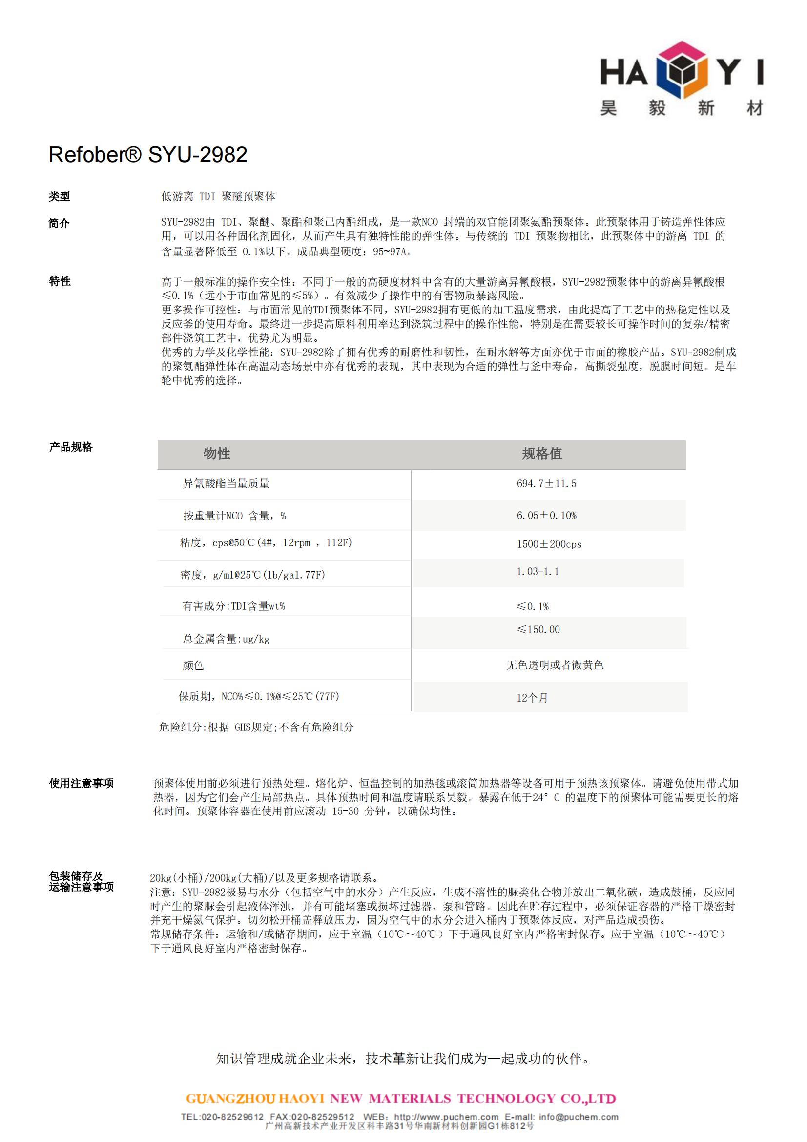 Refober® SYU-2982 低游离 TDI 聚醚预聚体 优秀的力学及化学性能 优秀的耐磨性和韧性