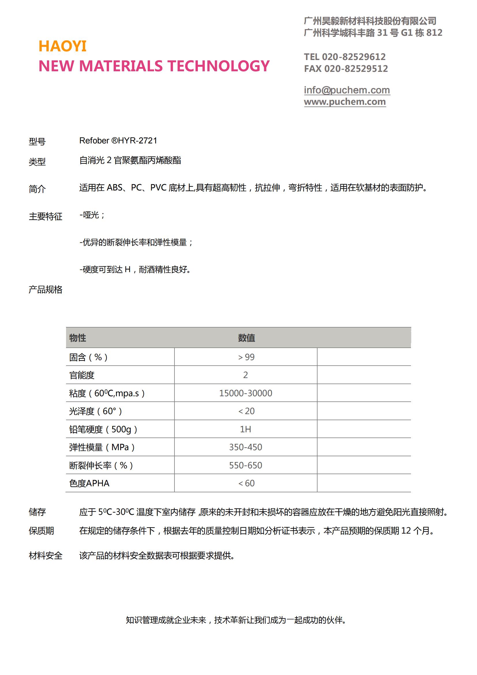 Refober ®HYR-2721 自消光 2 官聚氨酯丙烯酸酯 适用在 ABS、PC、PVC 底材上,具有超高韧性,抗拉伸,弯折特性,适用在软基材的表面防护
