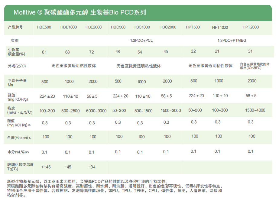 Mofltive ® 聚碳酸酯多元醇 生物基Bio PCD系列 HBE500 HBE1000 HBE2000 HBC500 HBC1000 HBC2000 HPT500 HPT1000 HPT2000