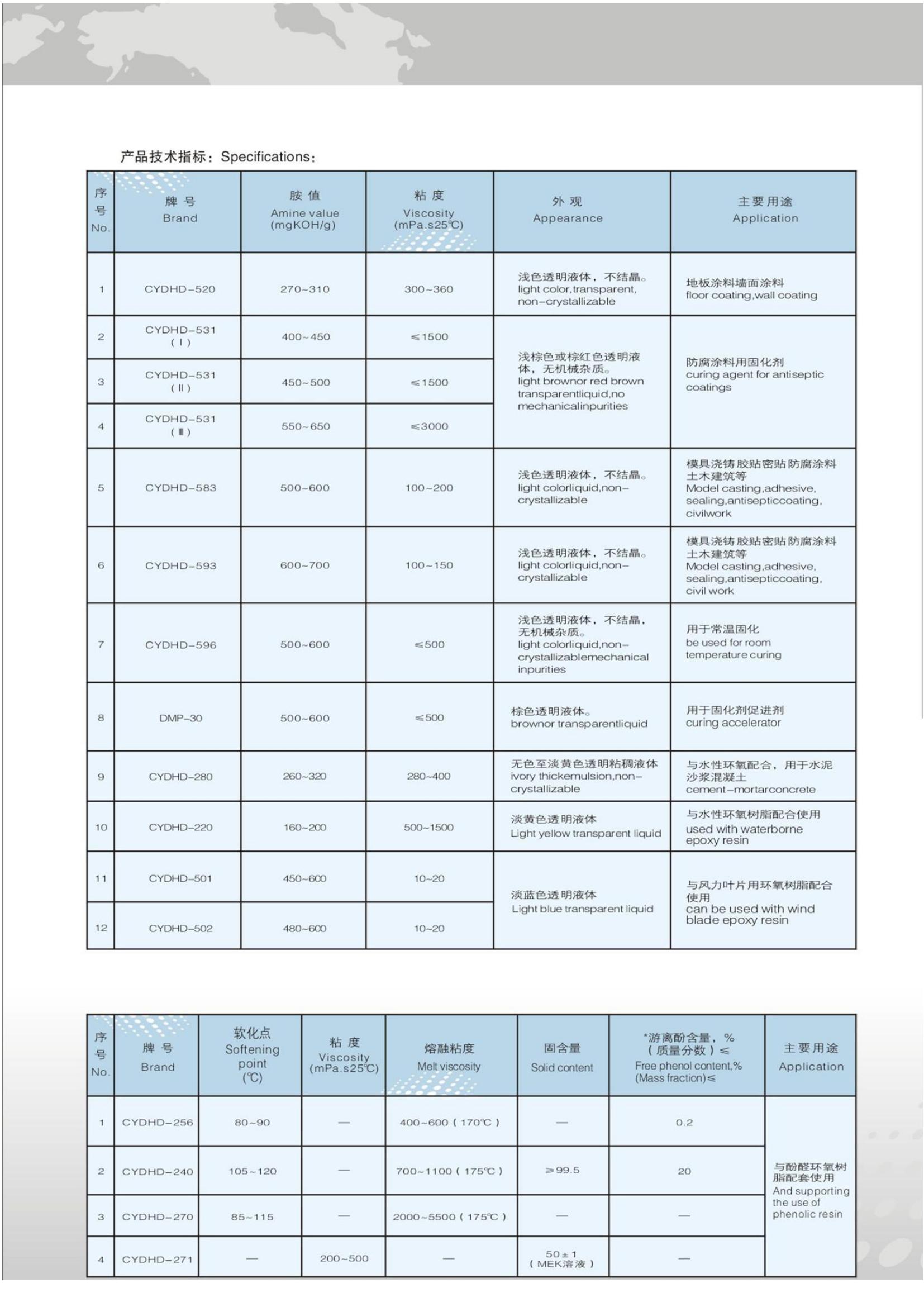 固化剂 CYDHD-520 CYDHD-531(Ⅰ) CYDHD-531(Ⅱ) CYDHD-531(Ⅲ) CYDHD-583 CYDHD-593 CYDHD-596 DMP-30 CYDHD-280 CYDHD-220 CYDHD-501 CYDHD-502