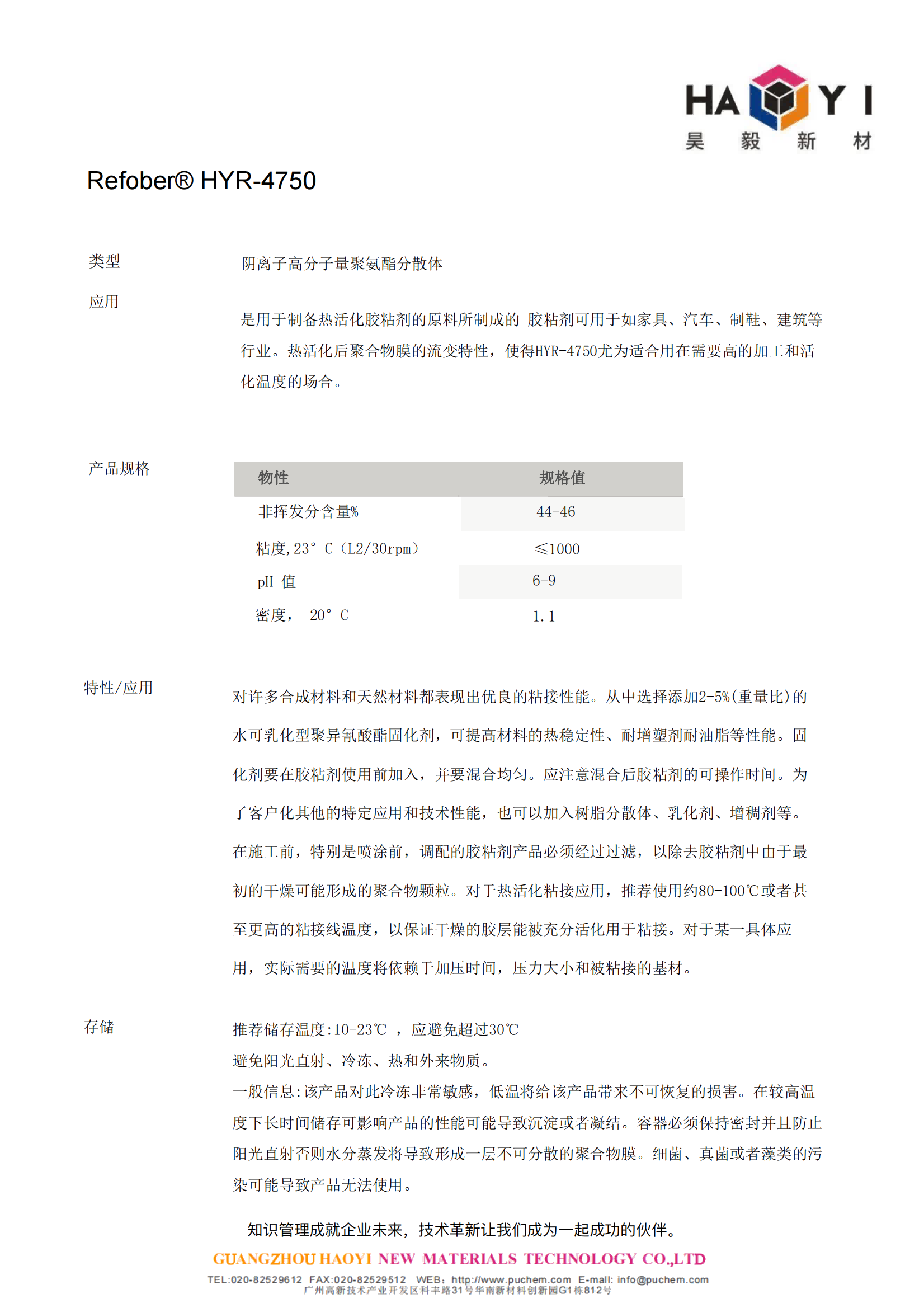 Refober® HYR-4750聚氨酯分散体,是用于制备热活化胶粘剂的原料所制成的 胶粘剂可用于如家具、汽车、制鞋、建筑等 行业