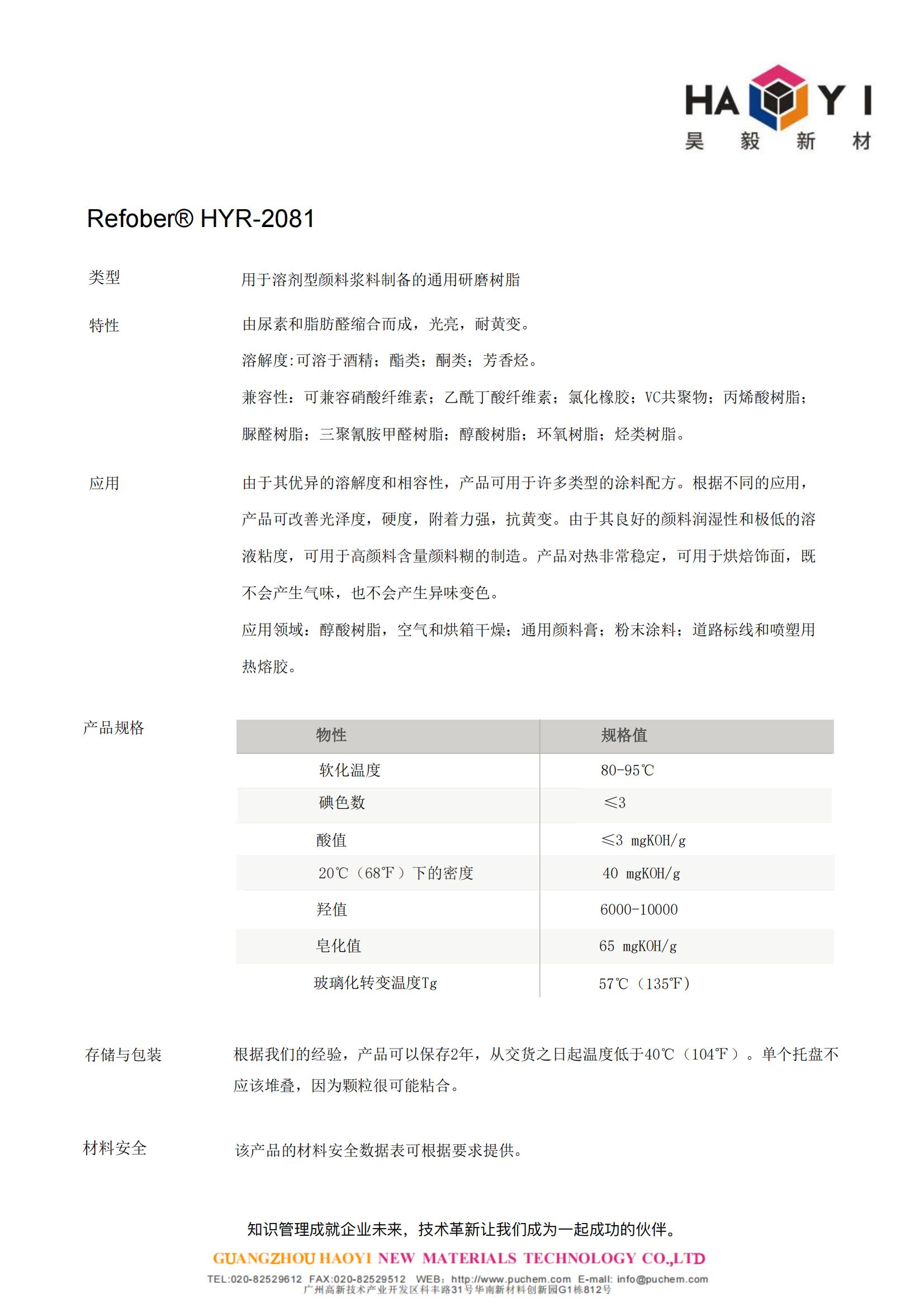 Refober® HYR-2081 用于溶剂型颜料浆料制备的通用研磨树脂 应用领域:醇酸树脂,空气和烘箱干燥;通用颜料膏;粉末涂料;道路标线和喷塑用热熔胶