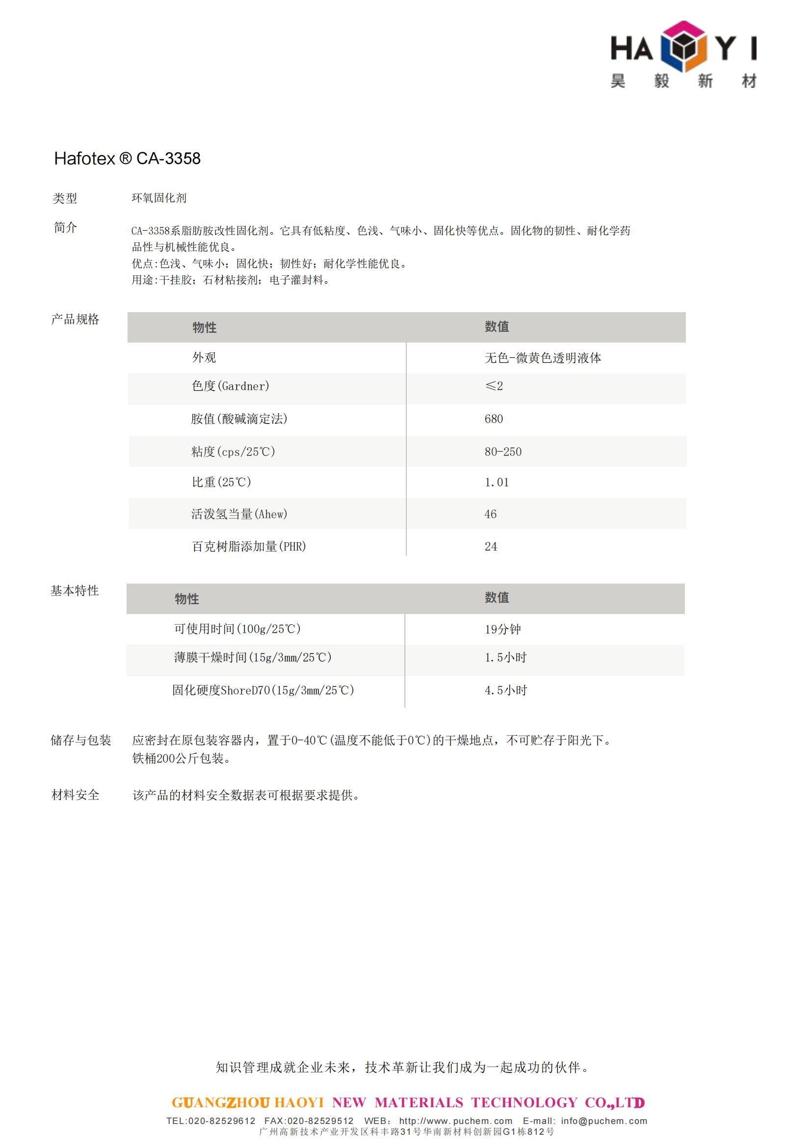 Hafotex ® CA-3358 环氧固化剂 脂肪胺改性固化剂 色浅、气味小;固化快;韧性好;耐化学性能优良 - Beplay官网网页