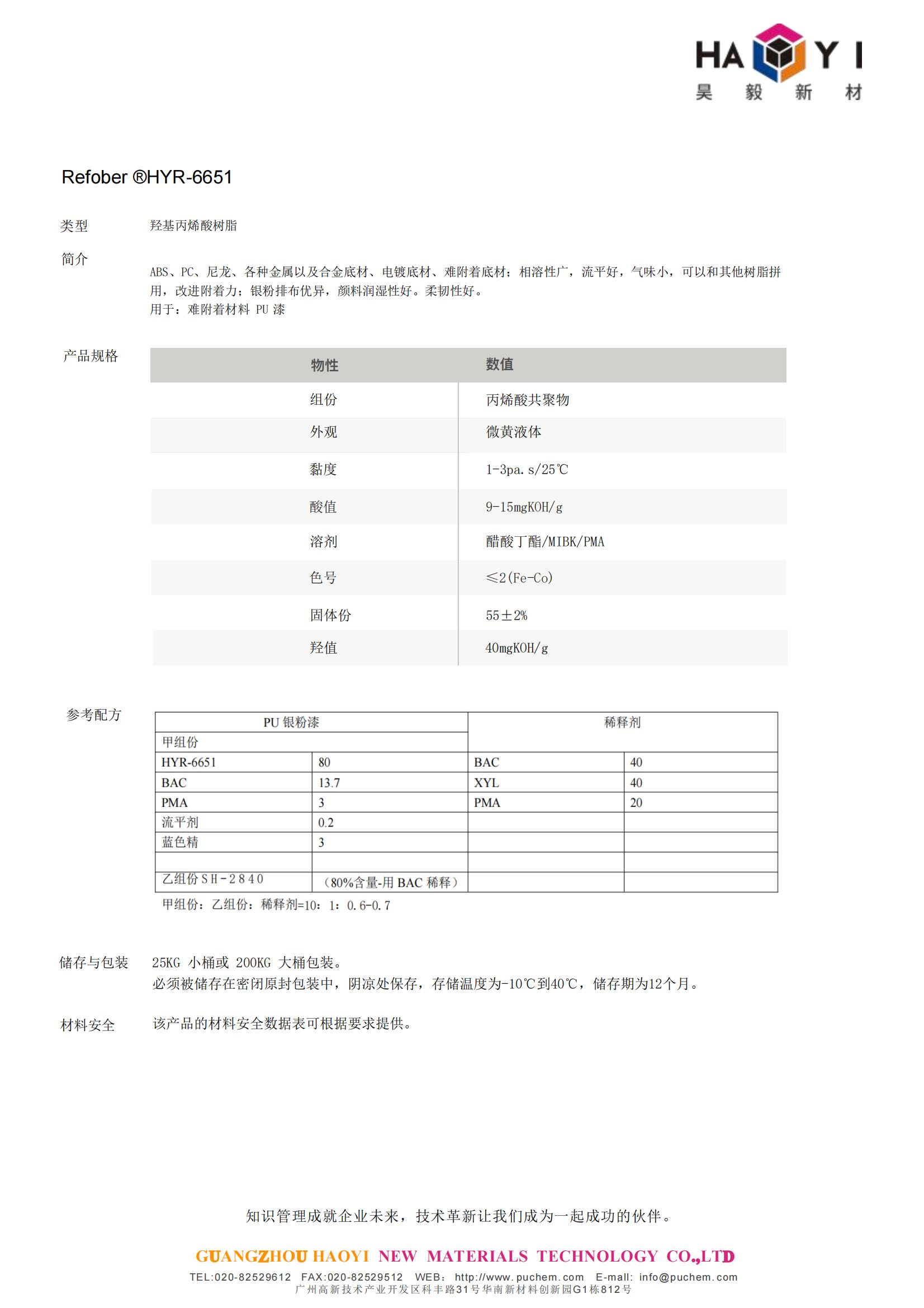 Refober ®HYR-6651 羟基丙烯酸树脂 ABS、PC、尼龙、各种金属以及合金底材、电镀底材、难附着底材 - Beplay官网网页