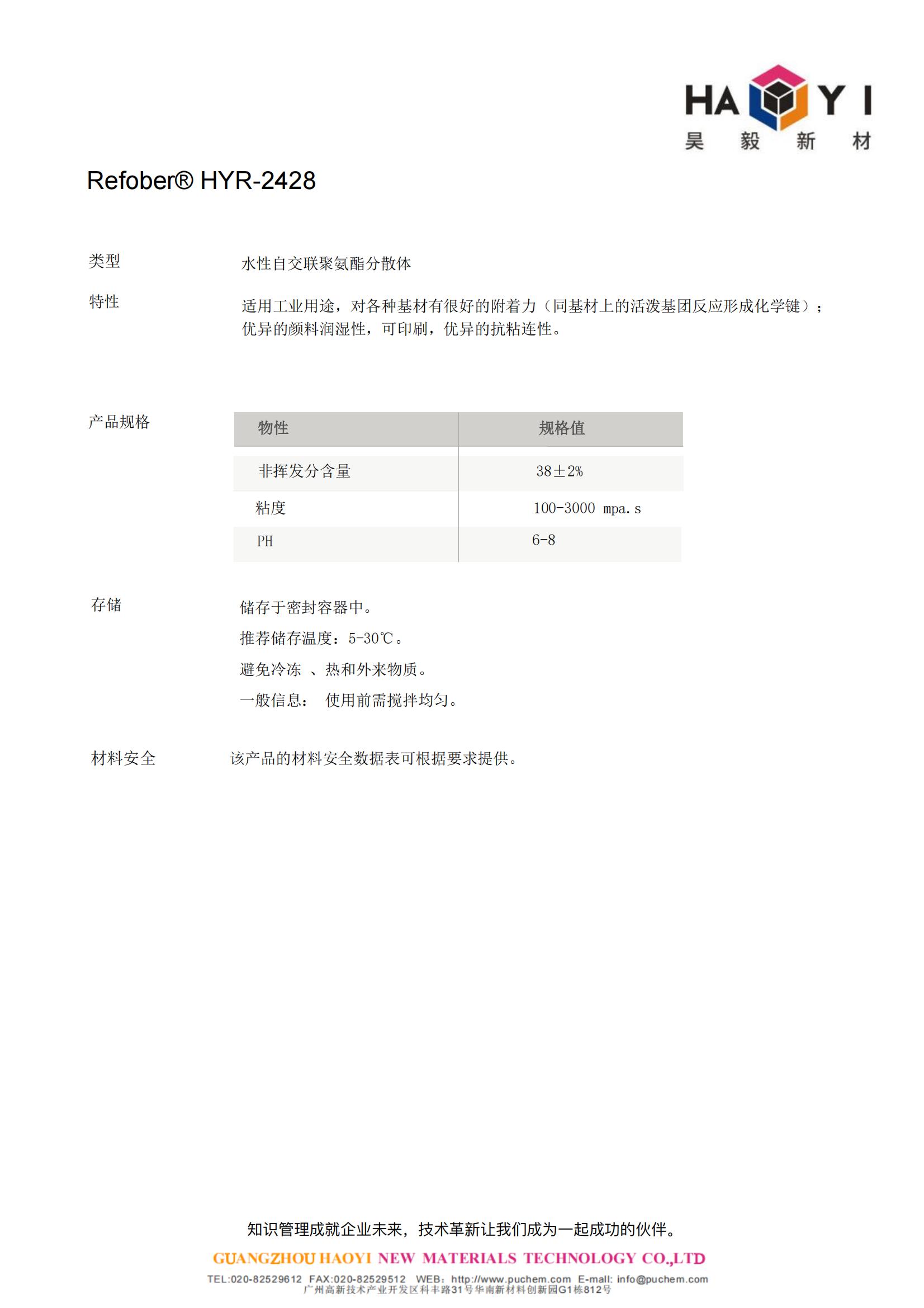 Refober® HYR-2428 水性自交联聚氨酯分散体 优异的颜料润湿性,可印刷,优异的抗粘连性 - Beplay官网网页
