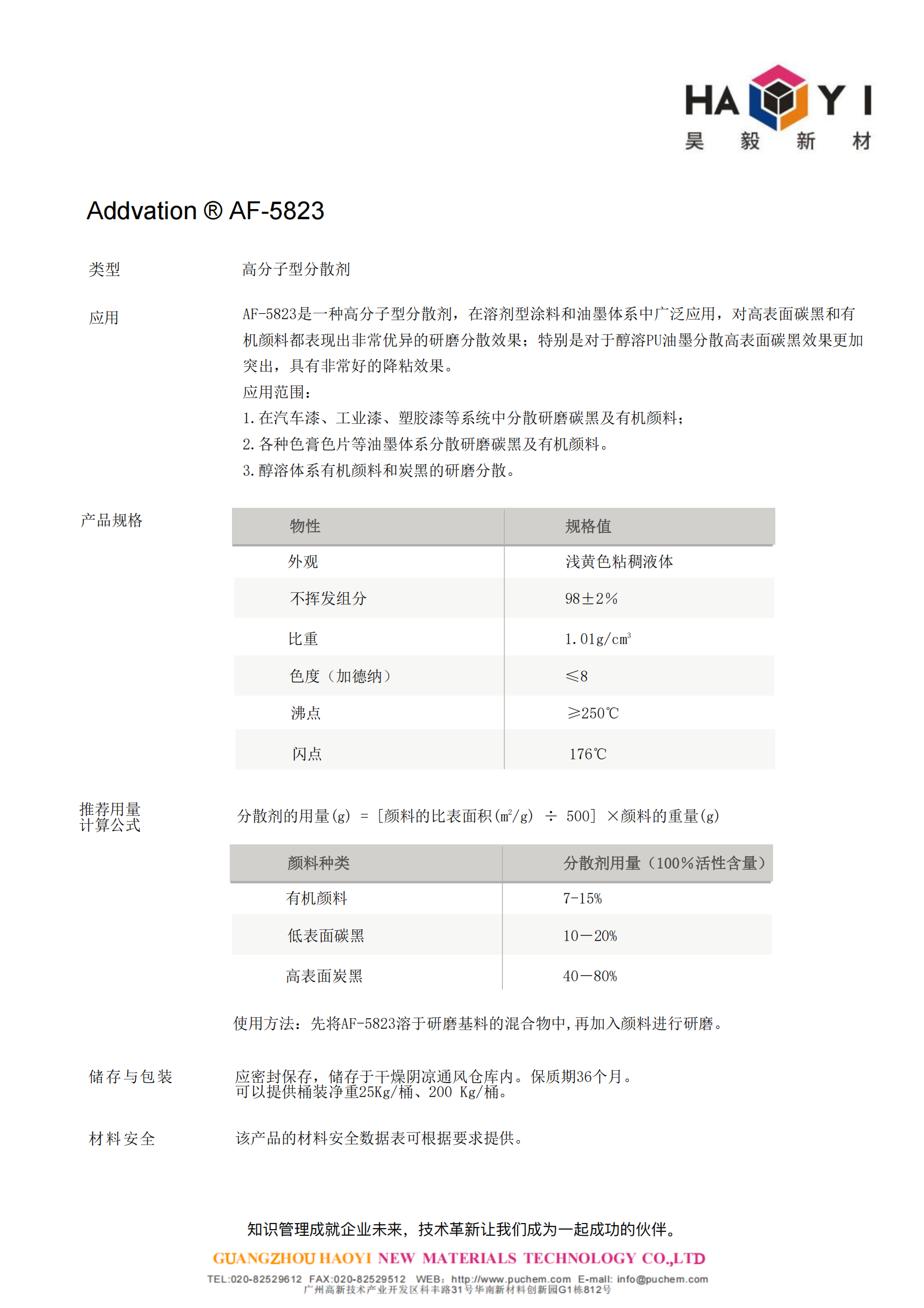 Addvation ® AF-5823高分子型分散剂,在溶剂型涂料和油墨体系中广泛应用,对高表面碳黑和有机颜料都表现出非常优异的研磨分散效果