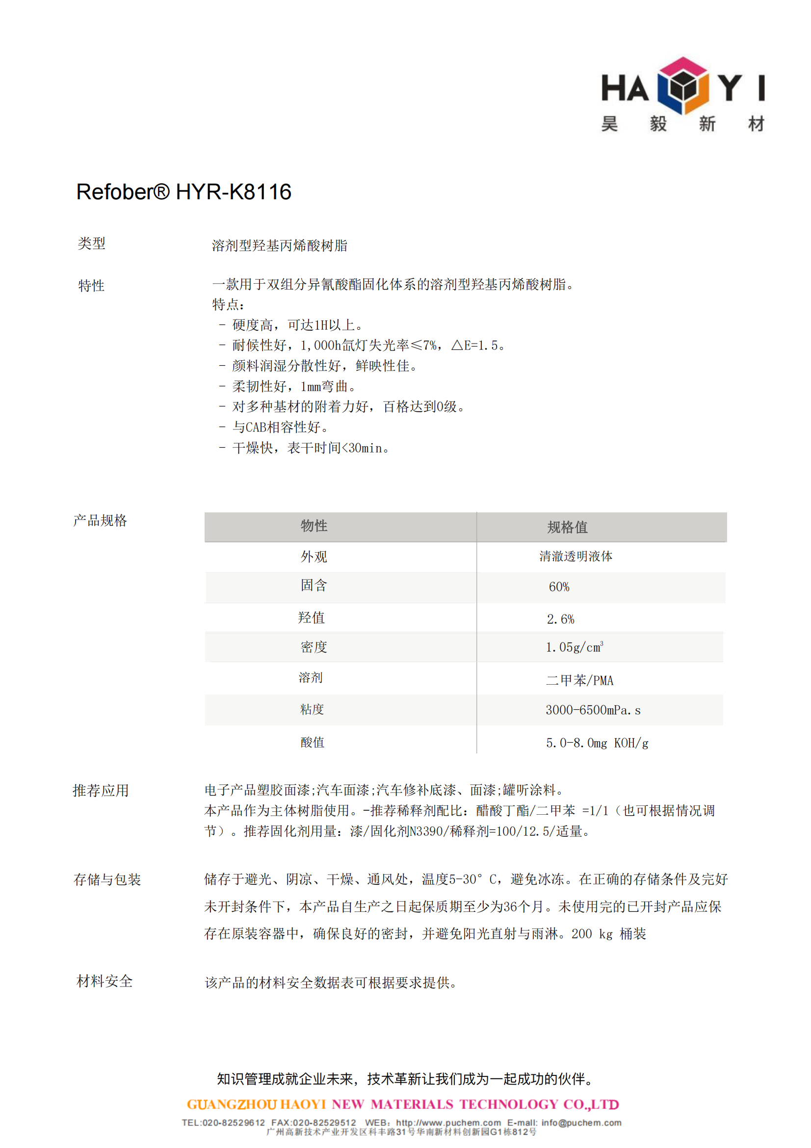 Refober® HYR-K8116溶剂型羟基丙烯酸树脂 硬度高、耐候性好、颜料润湿分散性好,鲜映性佳 - Beplay官网网页