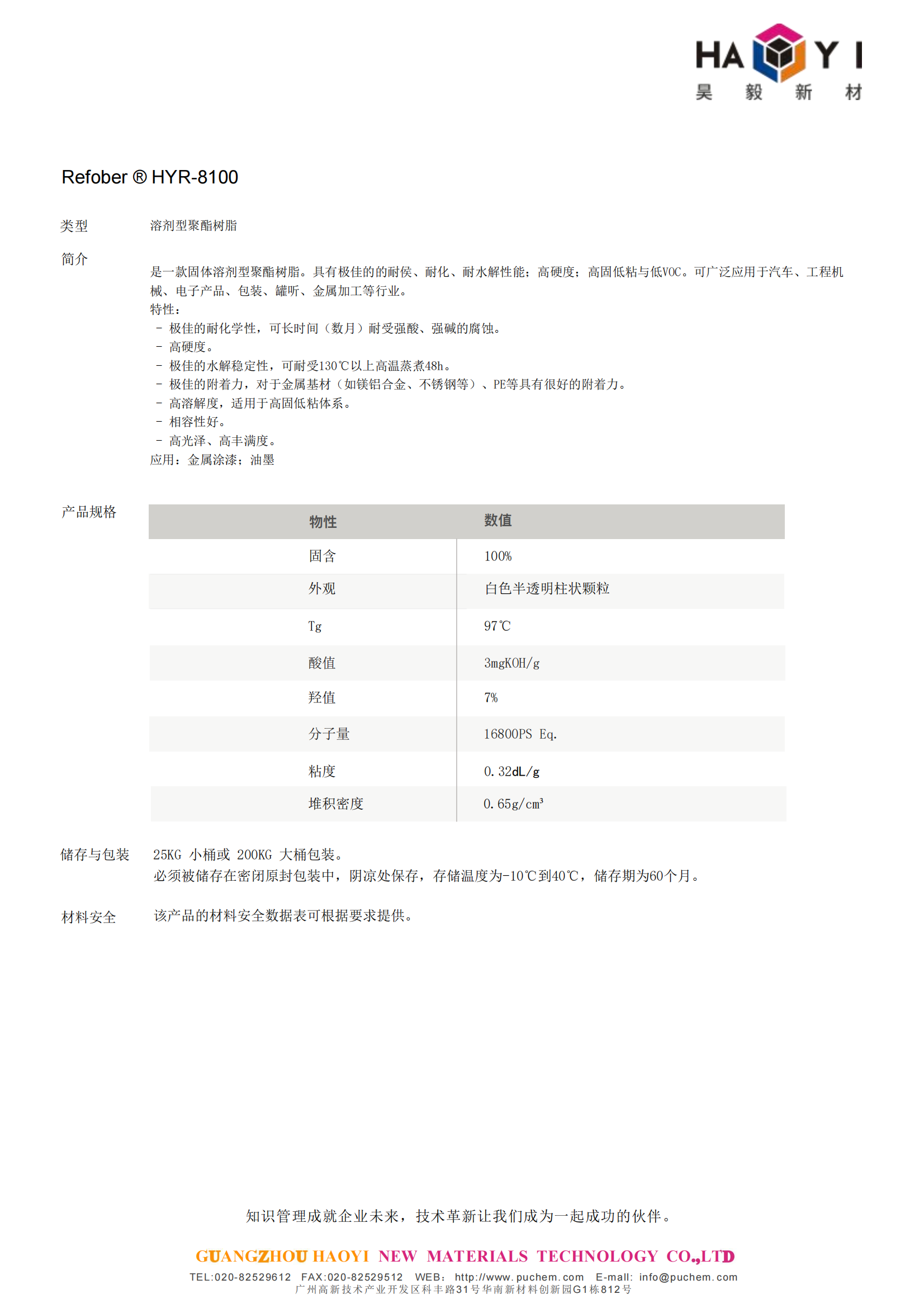 TDS-Refober ®HYR-8100溶剂型聚酯树脂 可广泛应用于汽车、工程机 械、电子产品、包装、罐听、金属加工等行业 - Beplay官网网页