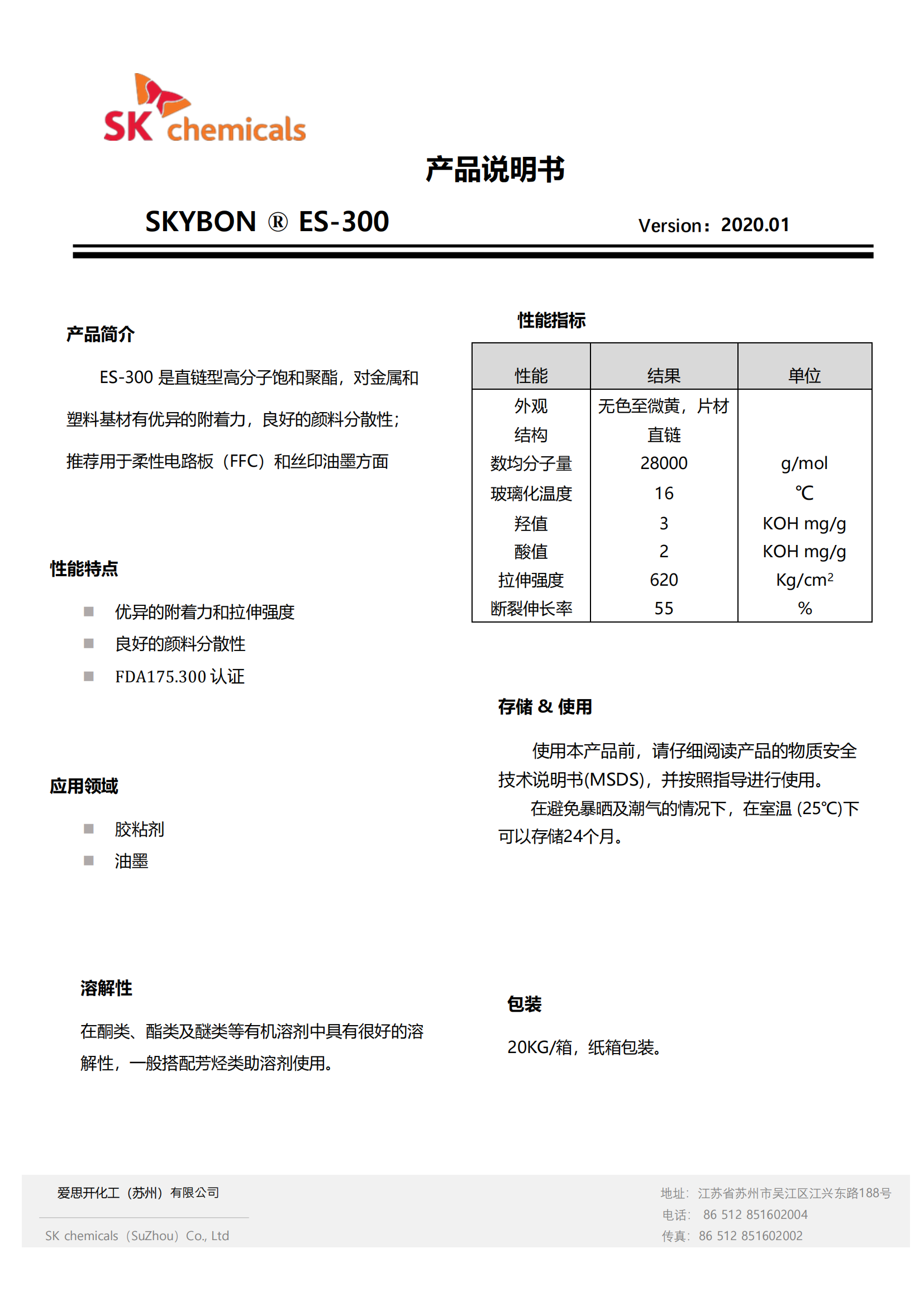 SKYBON ® ES-300高分子饱和聚酯 对金属和 塑料基材有优异的附着力,良好的颜料分散性; 推荐用于柔性电路板(FFC)和丝印油墨方面