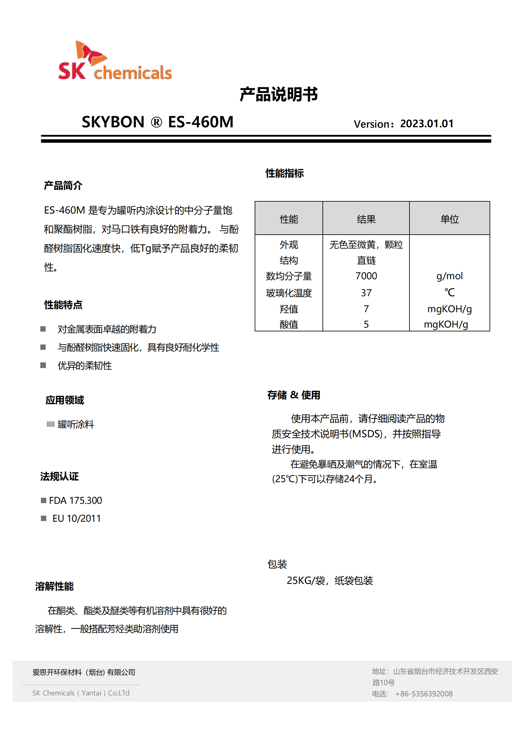 SKYBON ® ES-460M饱和聚酯树脂,对马口铁有良好的附着力。 与酚 醛树脂固化速度快,低Tg赋予产品良好的柔韧性