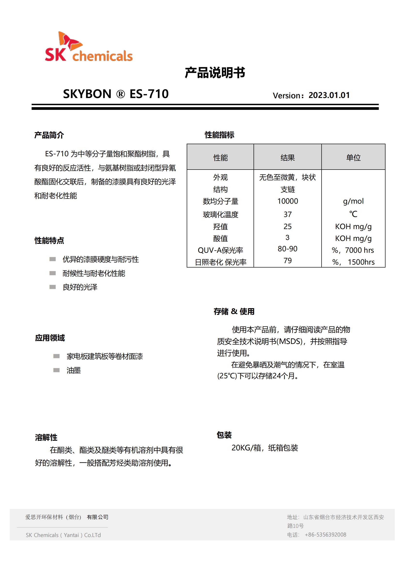 SKYBON ® ES-710饱和聚酯树脂,具有良好的反应活性,与氨基树脂或封闭型异氰 酸酯固化交联后,制备的漆膜具有良好的光泽 和耐老化性能