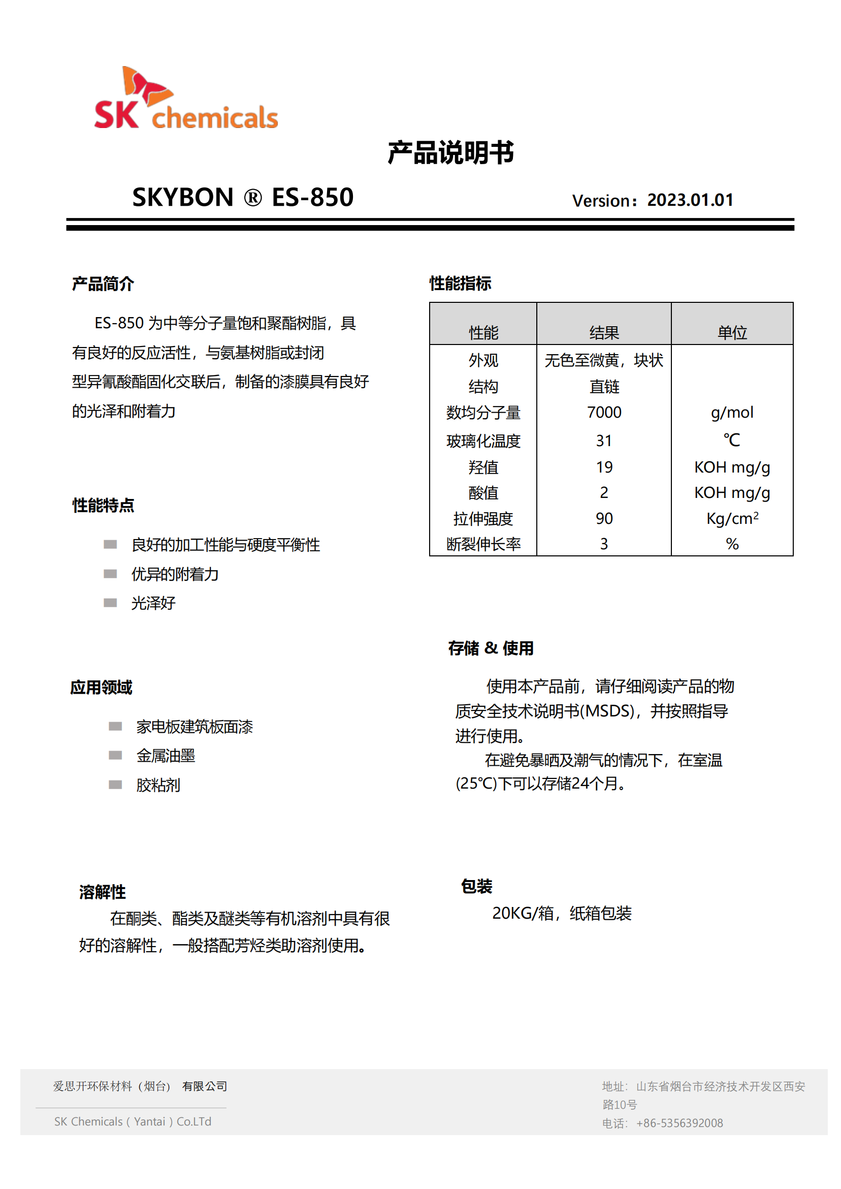SKYBON ® ES-850饱和聚酯树脂,具有良好的反应活性,与氨基树脂或封闭型异氰酸酯固化交联后,制备的漆膜具有良好的光泽和附着力