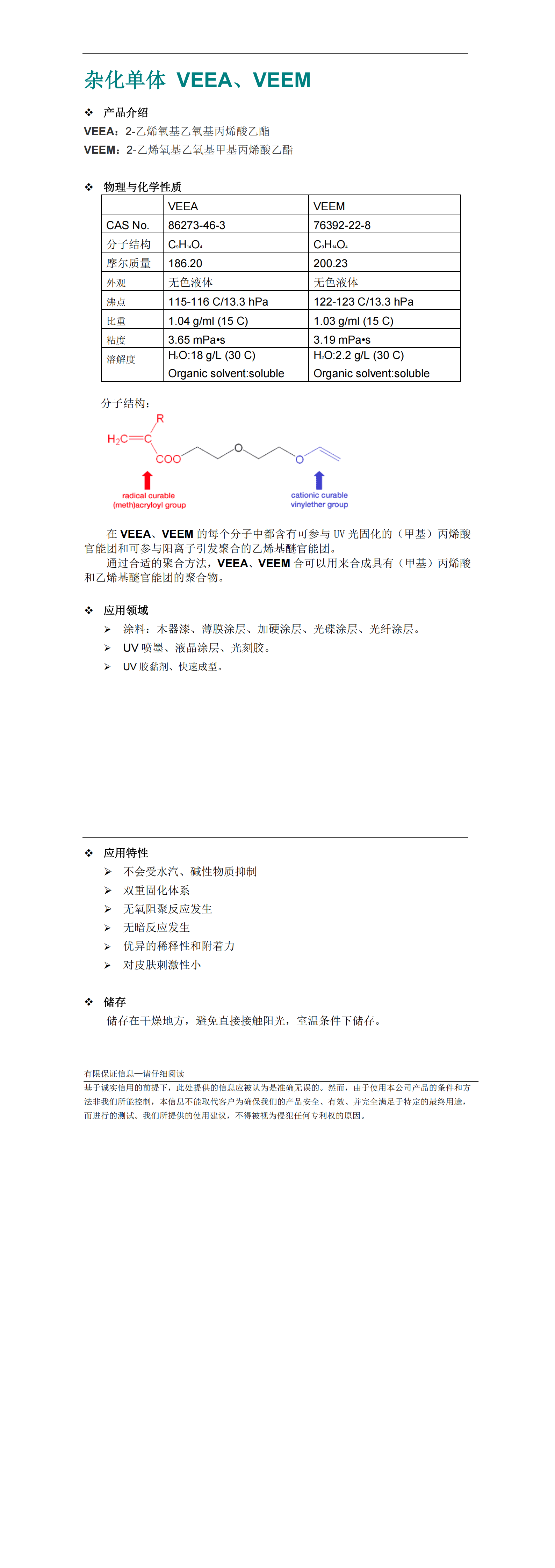 杂化单体 VEEA、VEEMVEEA:2-乙烯氧基乙氧基丙烯酸乙酯 VEEM:2-乙烯氧基乙氧基甲基丙烯酸乙酯