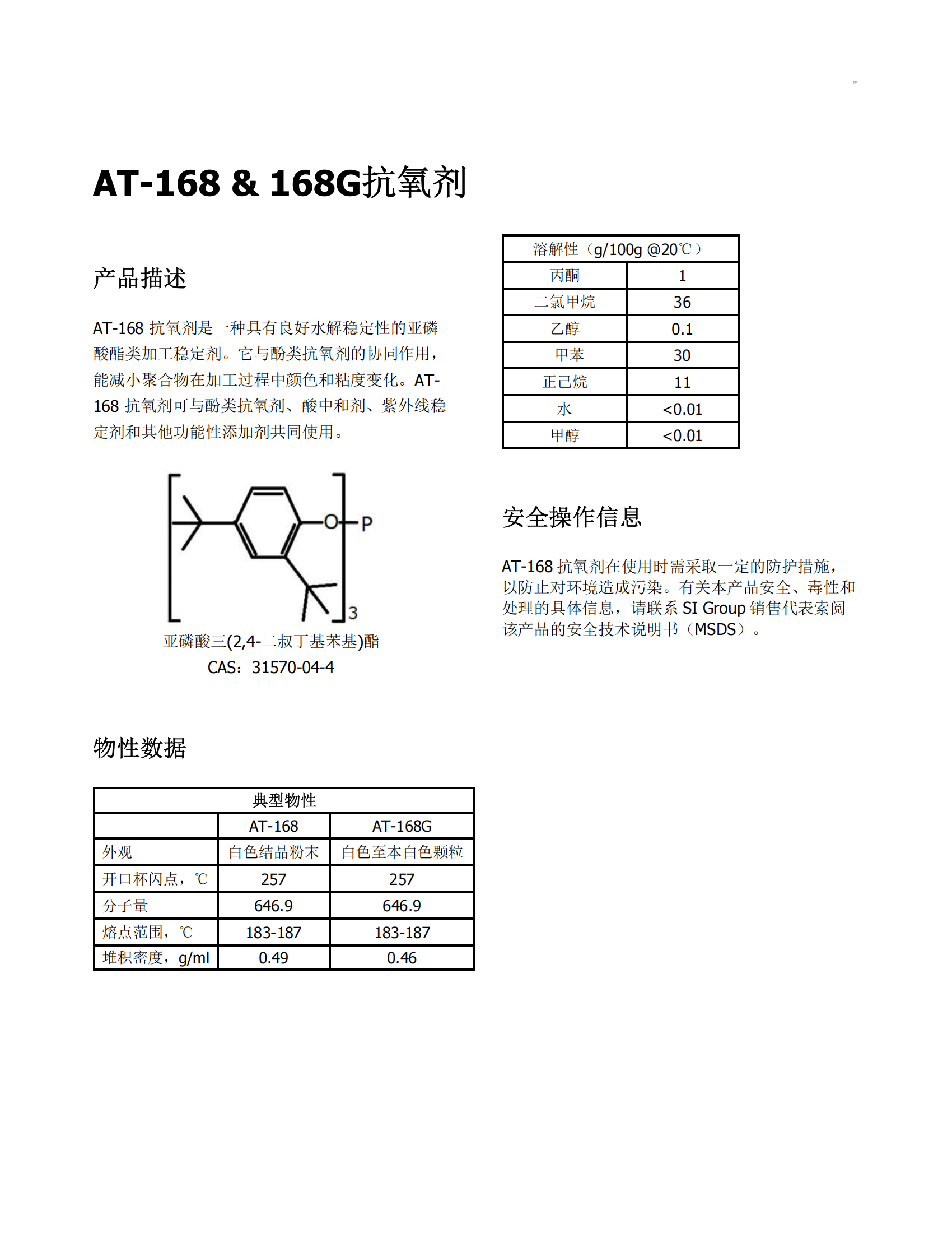AT-168 & 168G抗氧剂可与酚类抗氧剂、酸中和剂、紫外线稳 定剂和其他功能性添加剂共同使用