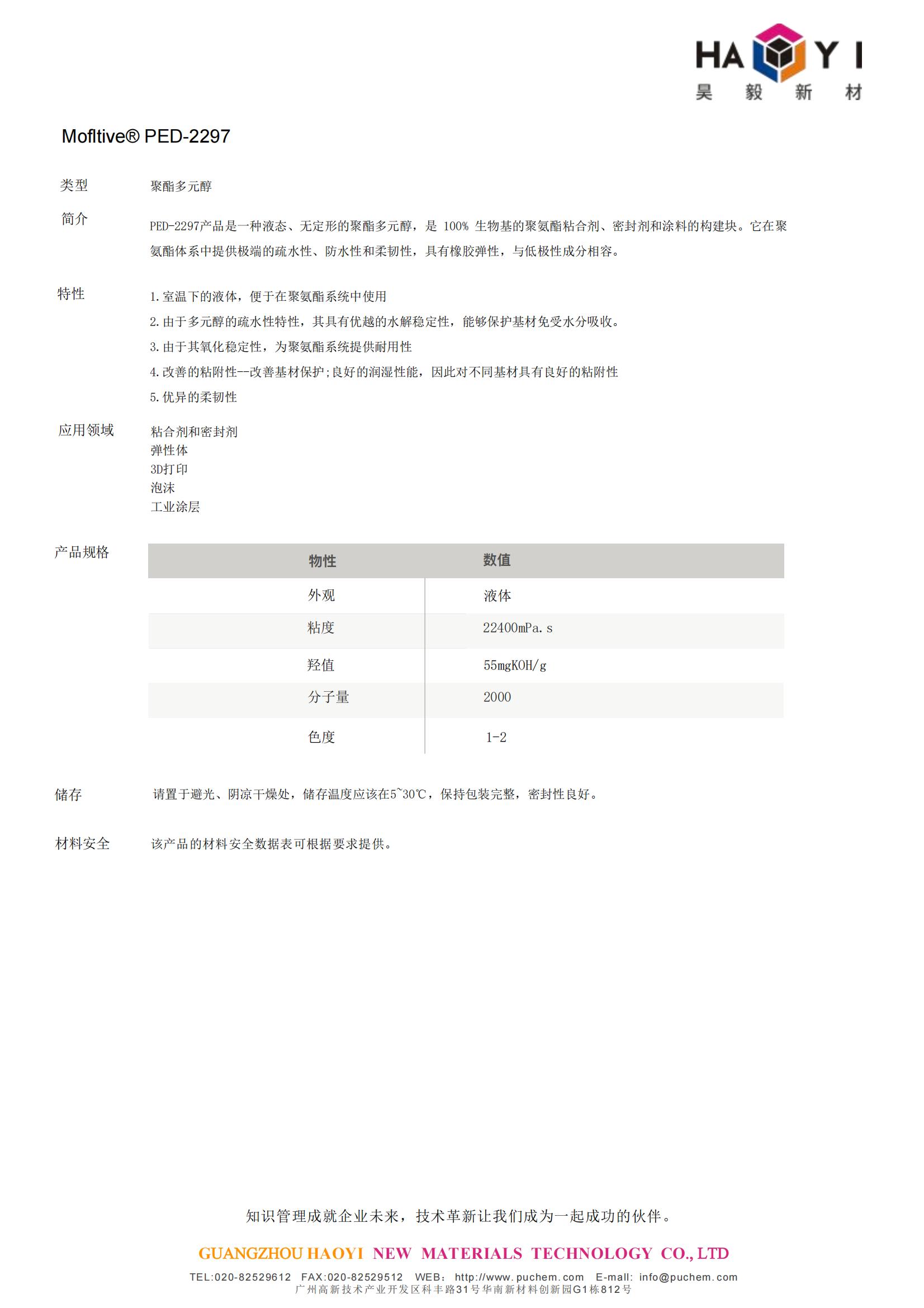 Mofltive® PED-2297 聚酯多元醇 是 100% 生物基的聚氨酯粘合剂、密封剂和涂料的构建块