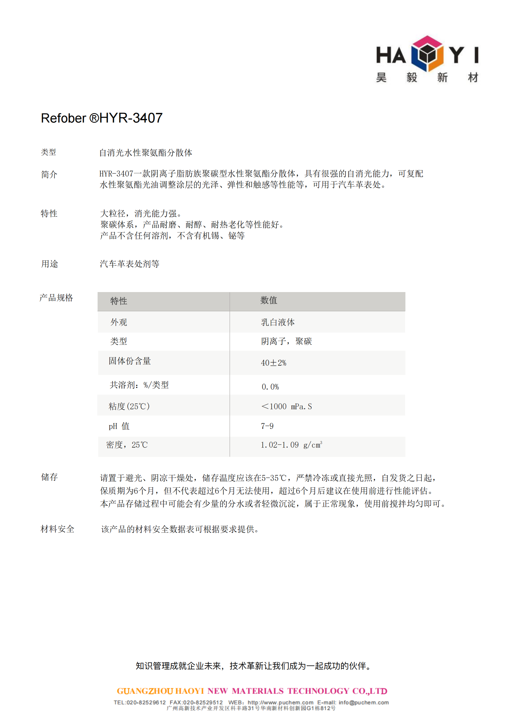 Refober ®HYR-3407一款阴离子脂肪族聚碳型水性聚氨酯分散体,具有很强的自消光能力,可复配 该产品的材料安全数据表可根据要求提供。 水性聚氨酯光油调整涂层的光泽、弹性和触感等性能等,可用于汽车革表处