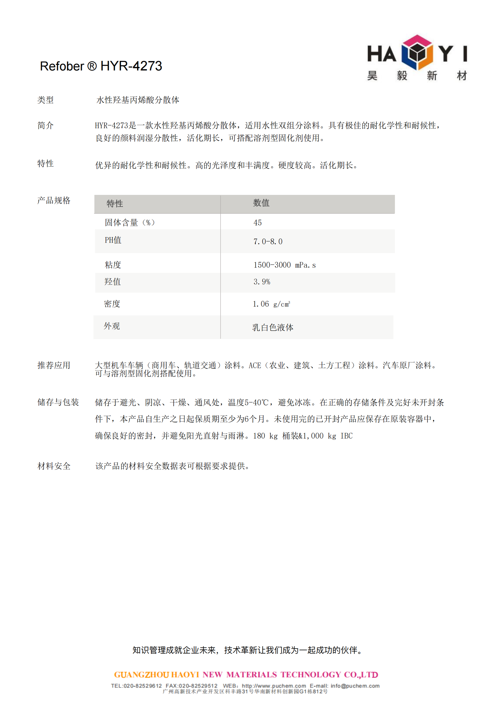 Refober ® HYR-4273是一款水性羟基丙烯酸分散体,适用水性双组分涂料。具有极佳的耐化学性和耐候性, 良好的颜料润湿分散性,活化期长,可搭配溶剂型固化剂使用