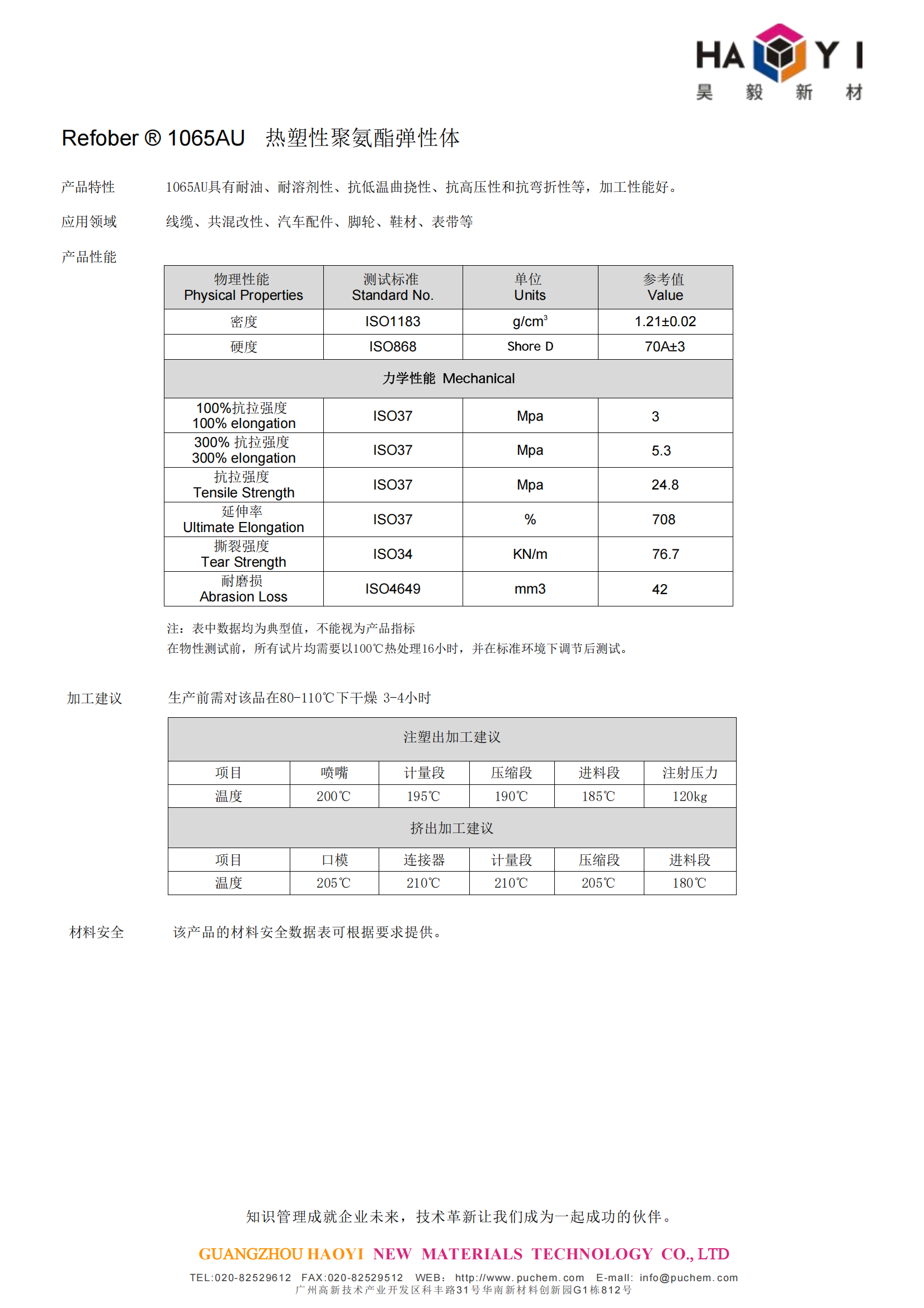 Refober ® 1065AU 热塑性聚氨酯弹性体,具有耐油、耐溶剂性、抗低温曲挠性、抗高压性和抗弯折性等,加工性能好