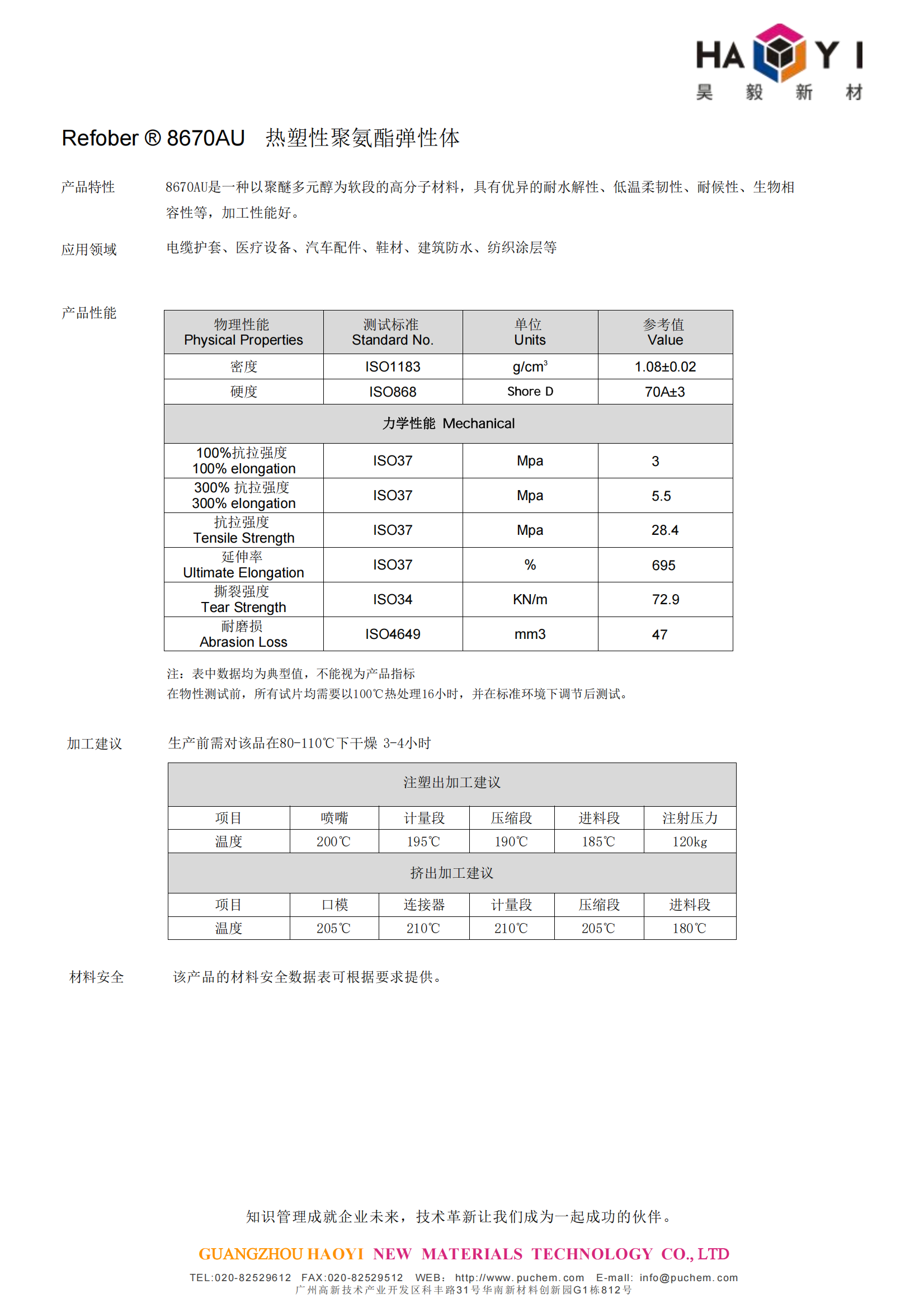 Refober ® 8670AU热塑性聚氨酯弹性体,应用领域 电缆护套、医疗设备、汽车配件、鞋材、建筑防水、纺织涂层等