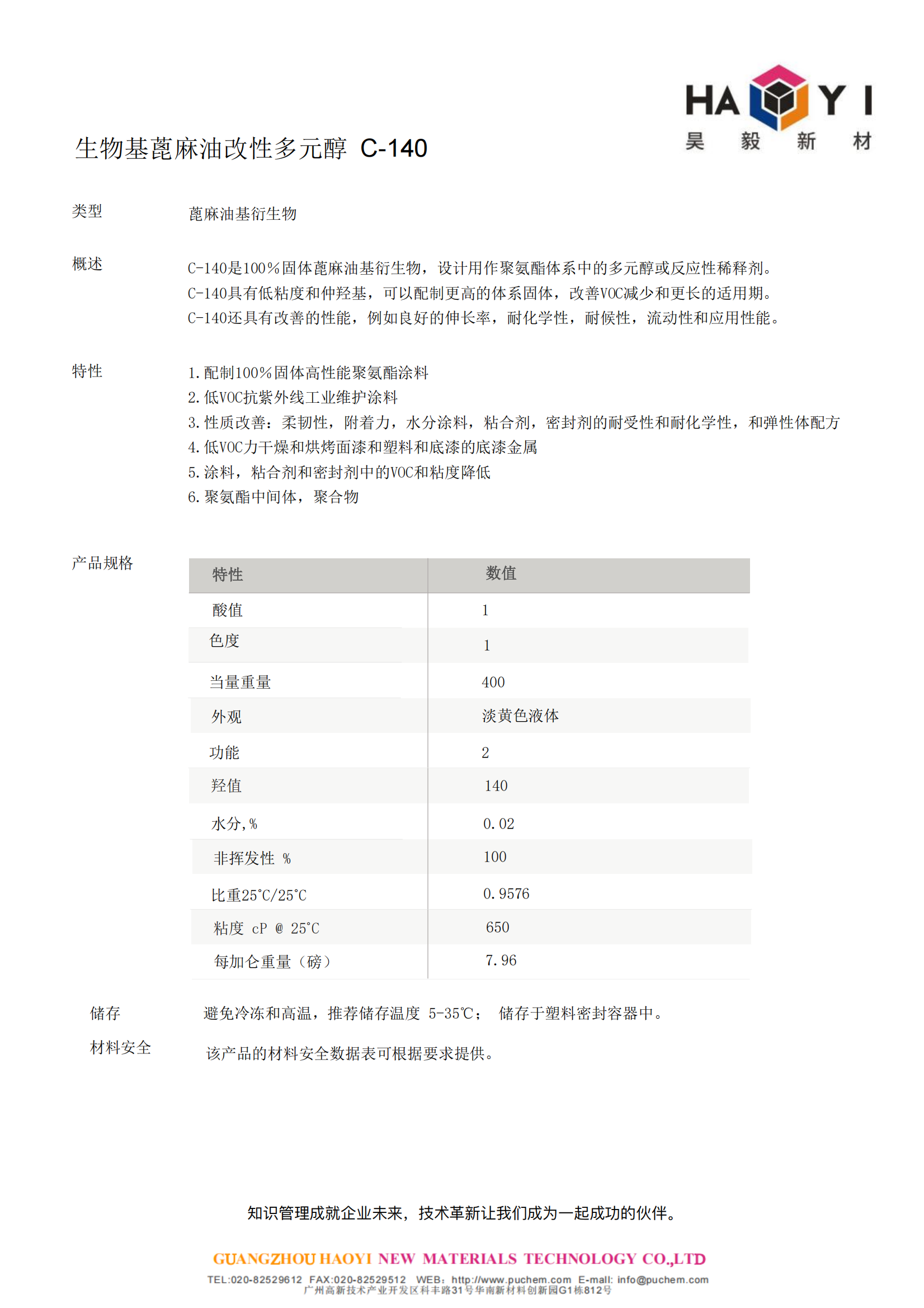 生物基蓖麻油改性多元醇 C-140,是100%固体蓖麻油基衍生物,设计用作聚氨酯体系中的多元醇或反应性稀释剂