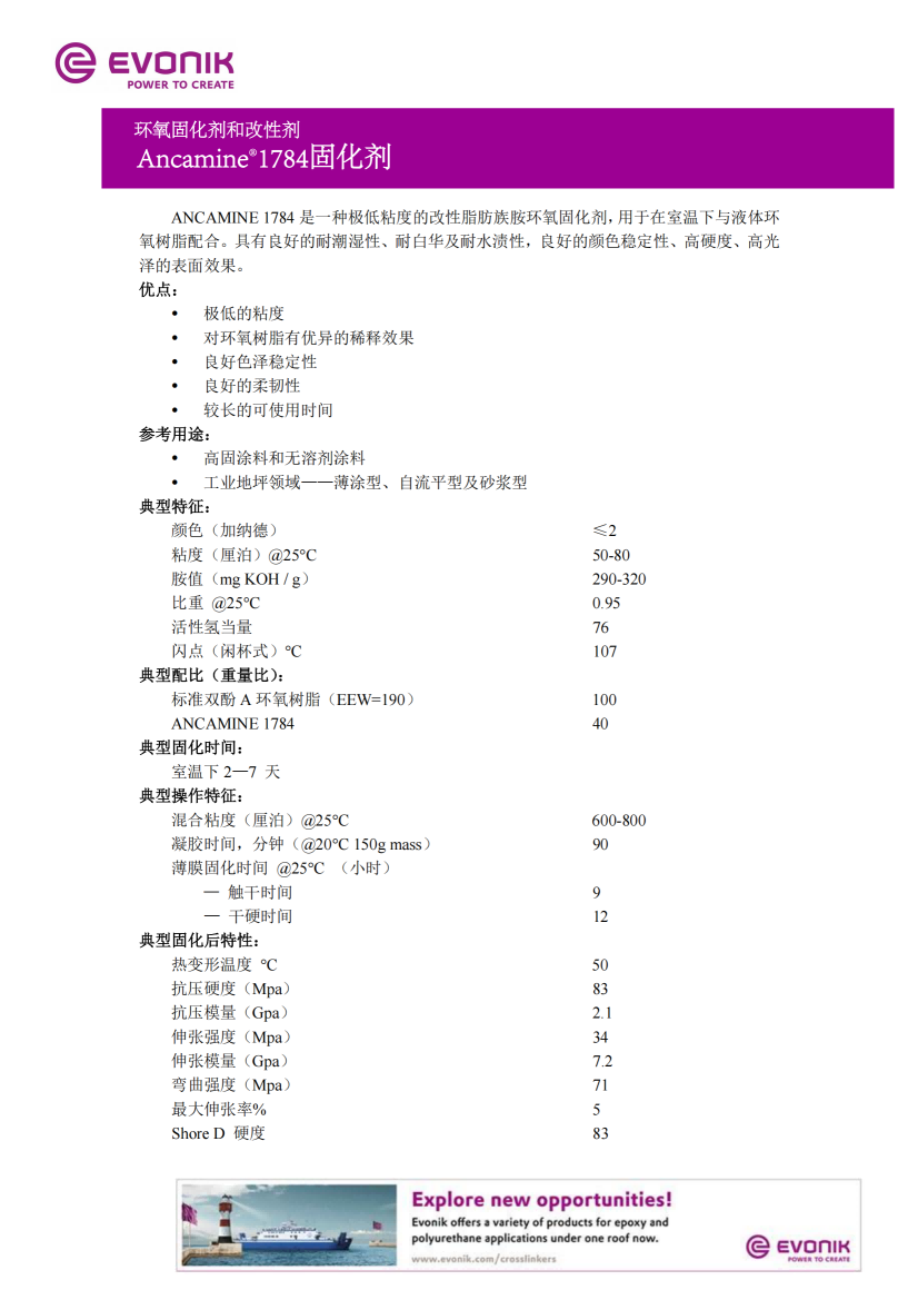 Ancamine®1784是一种极低粘度的改性脂肪族胺环氧固化剂,具有良好的耐潮湿性、耐白华及耐水渍性,良好的颜色稳定性、高硬度、高光 泽的表面效果