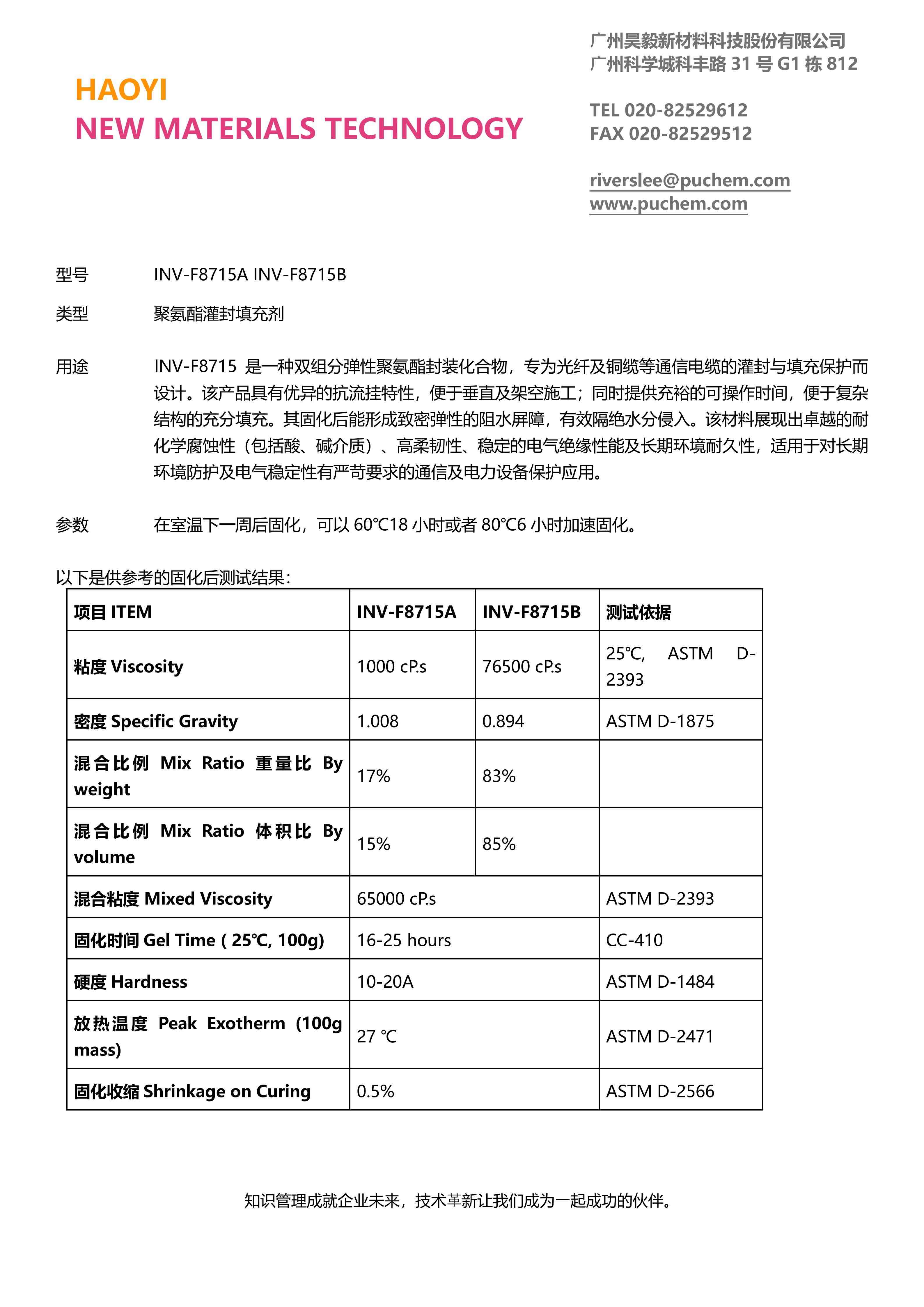 聚氨酯灌封填充剂 INV-F8715A INV-F8715B 专为光纤及铜缆等通信电缆的灌封与填充保护而设计