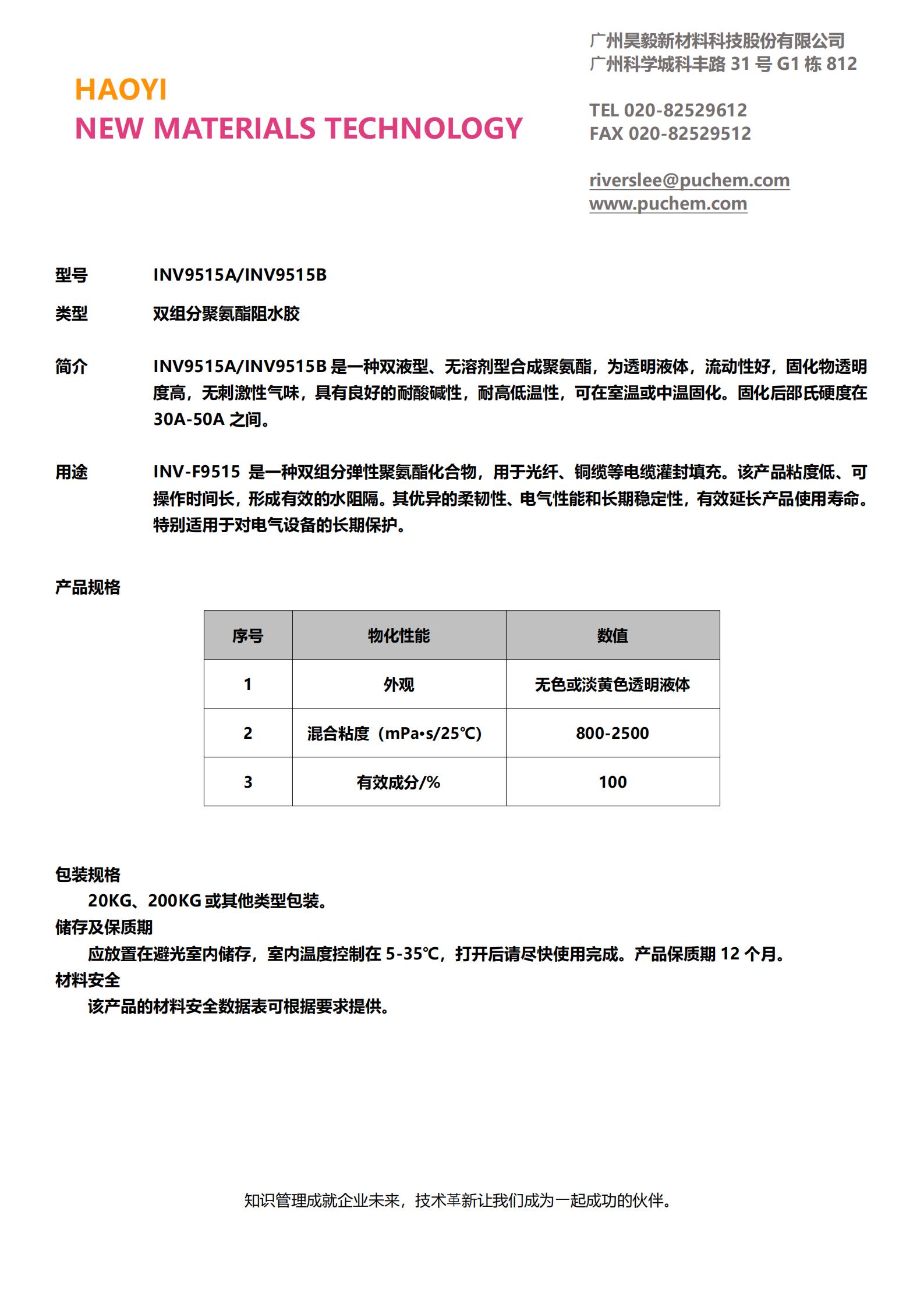 双组分聚氨酯阻水胶 INV9515A/INV9515B 一种双组分弹性聚氨酯化合物,用于光纤、铜缆等电缆灌封填充