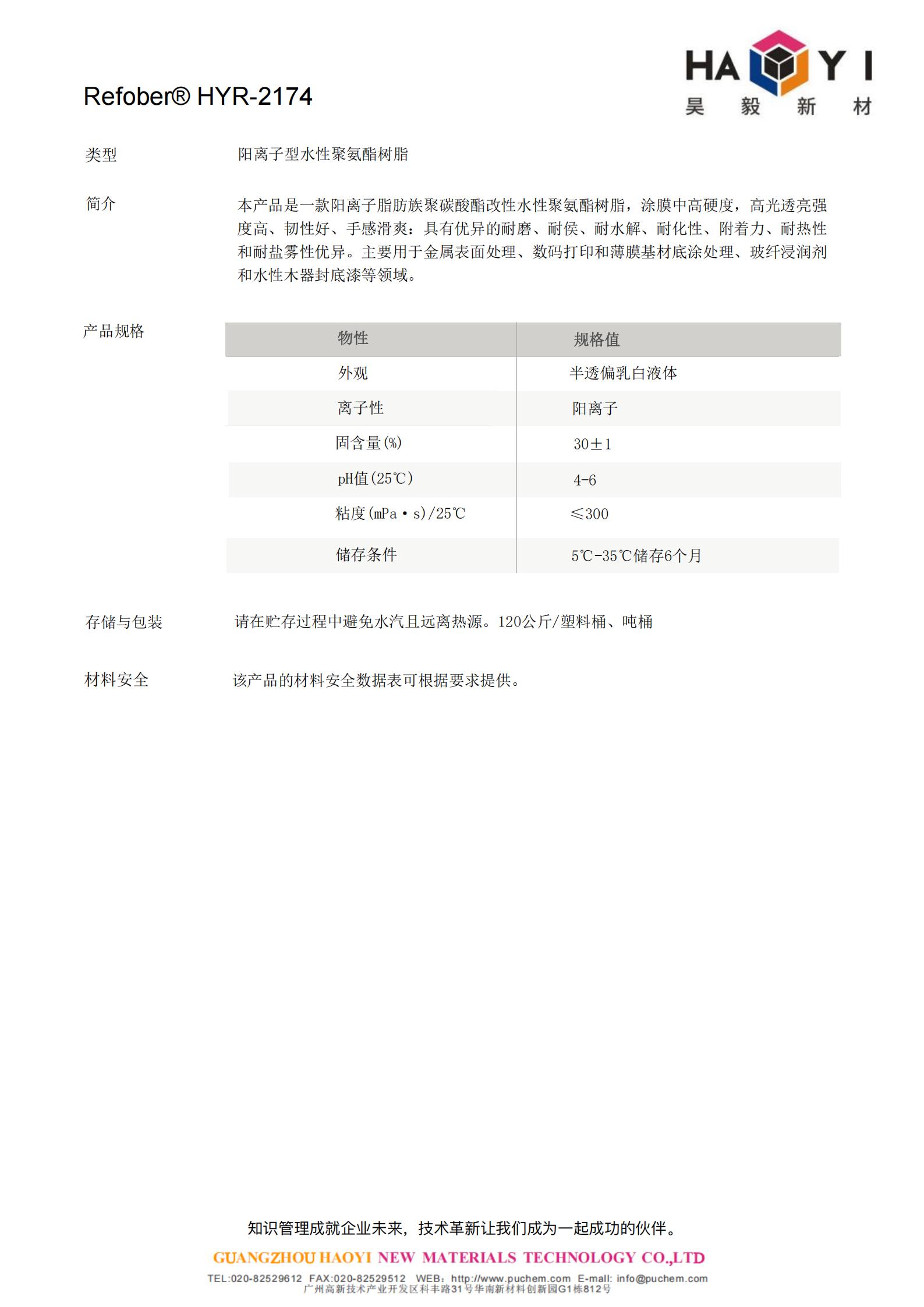 Refober®HYR-2174 阳离子型水性聚氨酯树脂 用于金属表面处理、数码打印和薄膜基材底涂处理、玻纤浸润剂和水性木器封底漆等领域